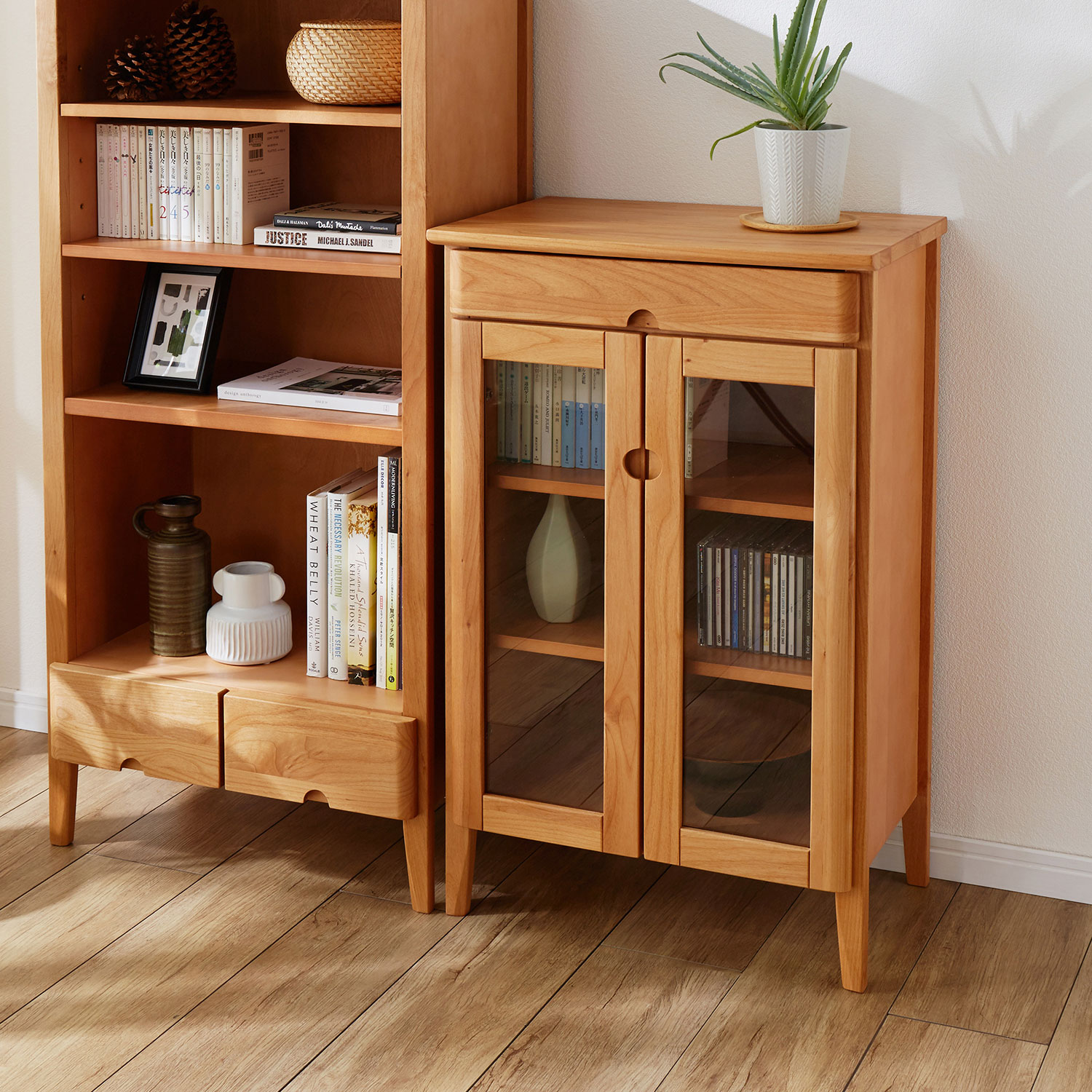 チェリー材とガラススライド扉の小さ目キャビネットは一人暮らしのミニマルな生活にちょうどいい