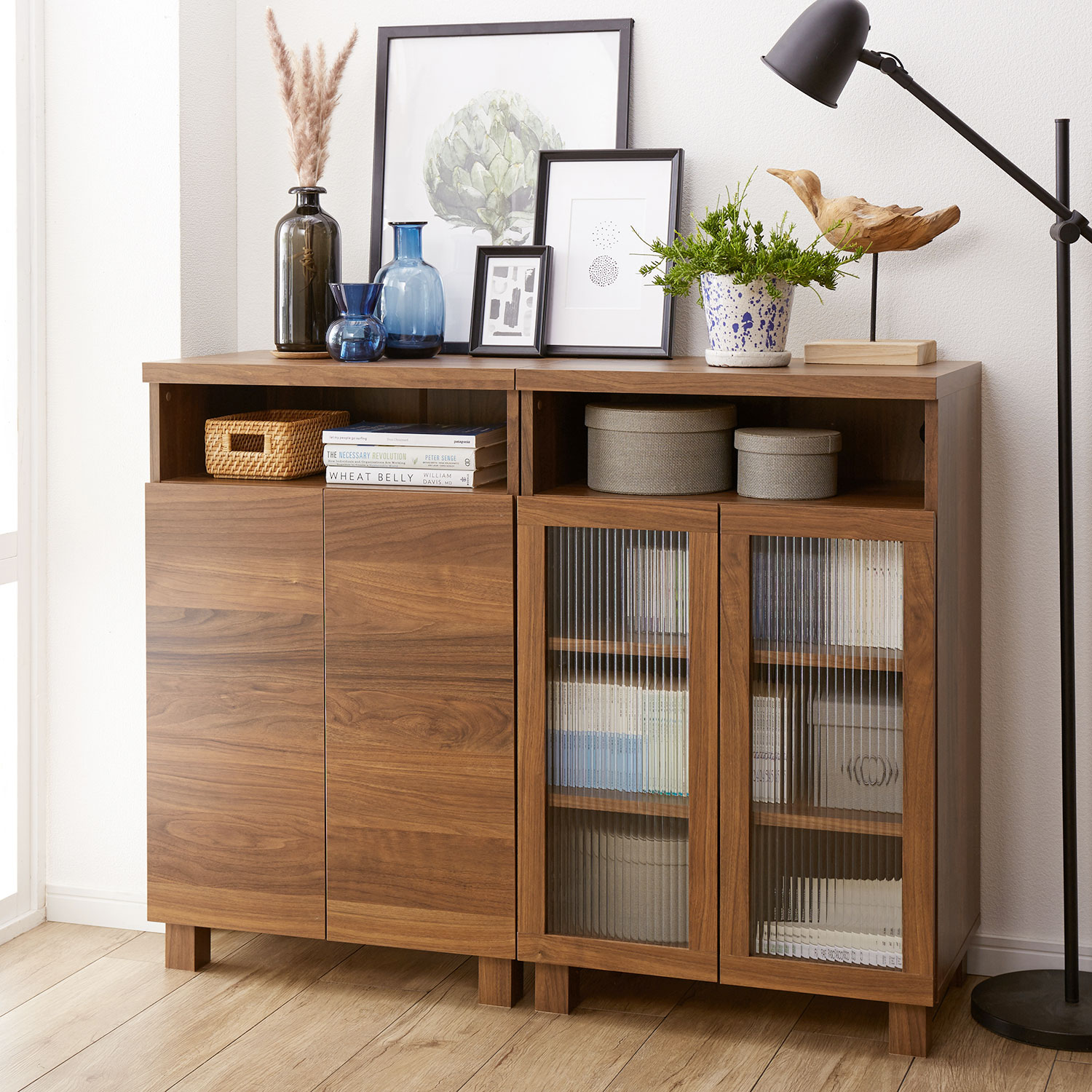 木目調のシートとガラス扉がマッチして、落ち着いた雰囲気のあるキャビネットです製品表面のウォルナット調シートには抗菌加工を施しております。抗菌加工のシートは細菌の増殖を抑制することができるので、より安心してお使いいただけます。オープン棚の背面にはコード通し穴があり、家電製品を収納してもOK中は可動棚なので、収納するものに合わせて3cmピッチで移動できます。同シリーズのリビングボードと一緒にコーディネートしてもGOOD