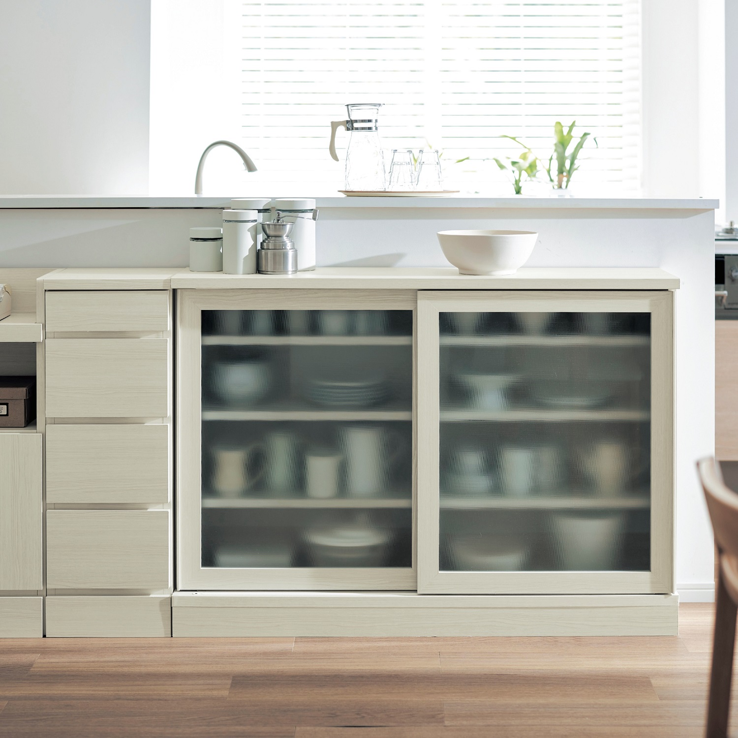 扉の前が狭いそんな場所のための引戸式 カウンターの高さが選べる今どきのマンションにもすっきり収まる高さ85cm ソファーやダイニングテーブルが近くにあっても気にせず開閉できる引戸式 奥行もわずか30cmと省スペース 空間を有効に活用しながら収納力を広げます。 隠す収納なら板扉タイプ ほんのり透けるガラス扉タイプは食器の収納に