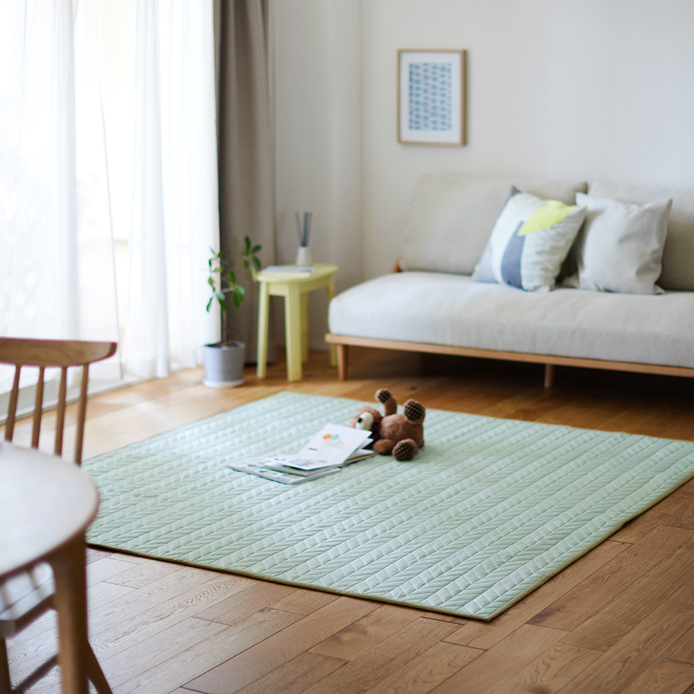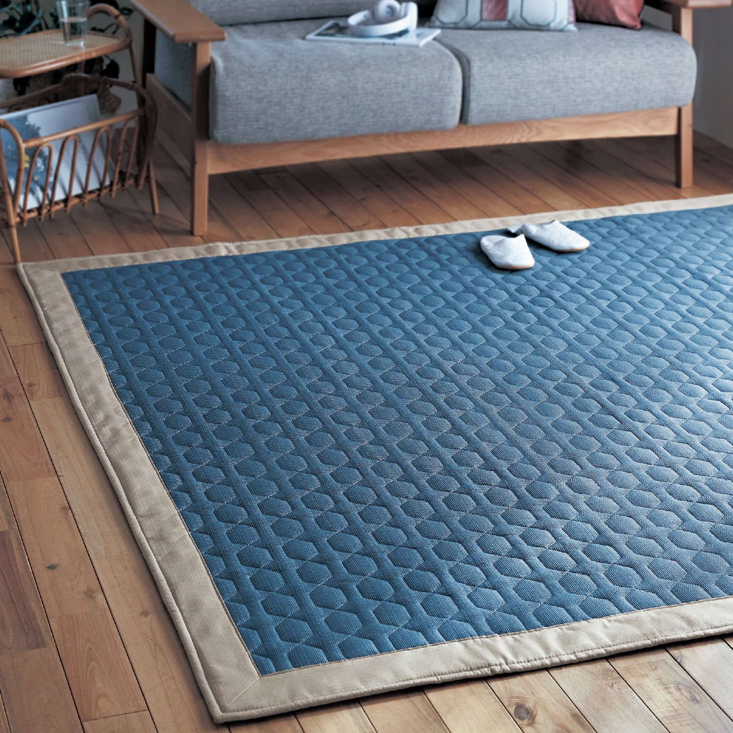 ーデザイン・スタイリングー・繊細な地模様が格上のニュアンス・柄を切替えて大人シックにデザイン・ストレートなキルトパターンもひと味違う印象・広げるだけでフロアを北欧風に演出ー素材ー・年中使えるサラリとした綿素材で風合いもグッド・しっかりとした素材感に高級感漂うー機能ー・ホットカーペット対応で一年中重宝・洗濯機で手軽に洗えてお手入れもスムーズ