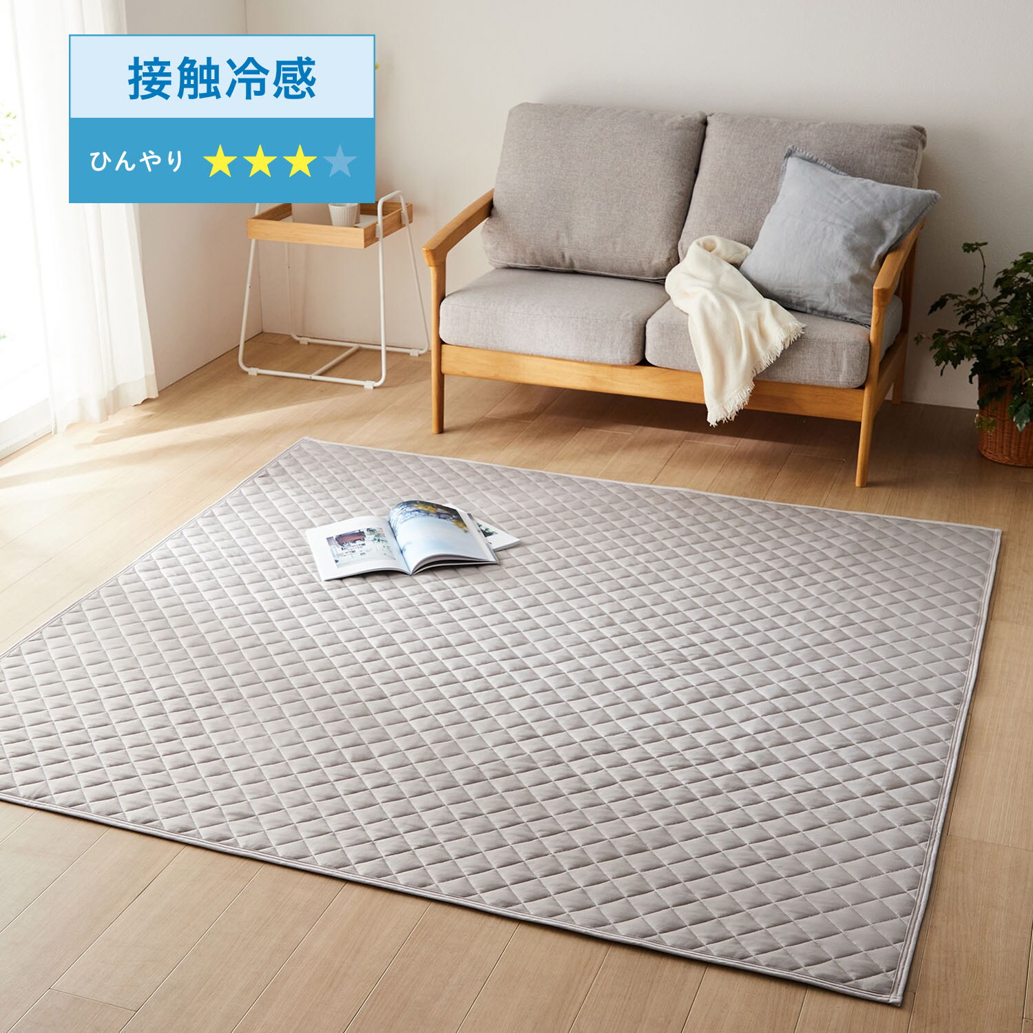ひんやりと心地いい接触冷感素材を使用冷感性に優れたナイロン100%にこだわった表地表地と中わたは吸水速乾機能付きなので、汗を吸って乾きやすい中わたはさらに防ダニ機能付きでお子様のいるご家庭にもおすすめインテリアになじむくすみカラー4隅ゴムバンド付きで別売りのアンダーラグとの組合わせもおすすめ裏面滑り止め付き汚れたら洗濯機で丸洗いできます。接触冷感レベル本商品の触れた瞬間のひんやりレベルは・・・【「適度なひんやり」ひんやり】