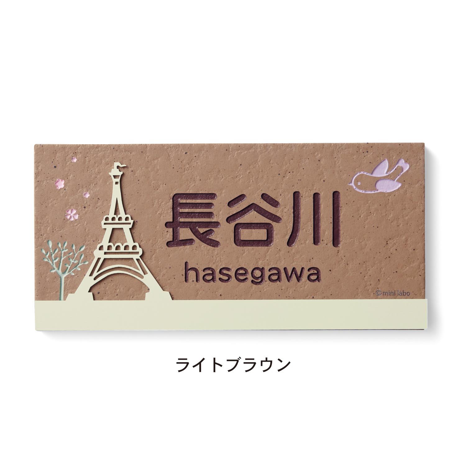 ナチュラルなタイルにエッフェル塔を添えた表札サビに強く上質感があるデザイン右上のコトリもかわいいアクセントに文字は、漢字のみ・アルファベットのみ・漢字アルファベット混合の3タイプから)