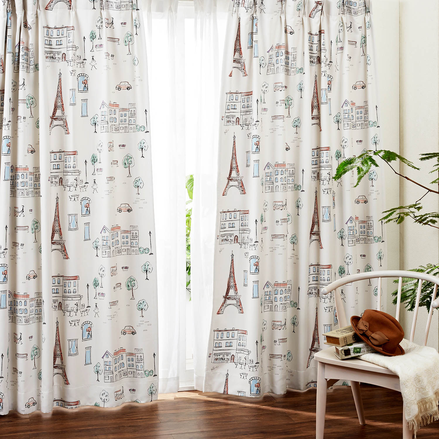 毎日の生活に彩りと楽しさを添えるテキスタイルブランド「Plune.」のオーダーカーテンイラストレーターとしても活躍するデザイナー堀内映子さんがエッフェル塔やカフェ、公園など、パリの街をかわいらしく描きましたほどよく光を遮る2級遮光機能付きお家で洗えるので、いつでも清潔に使えます)