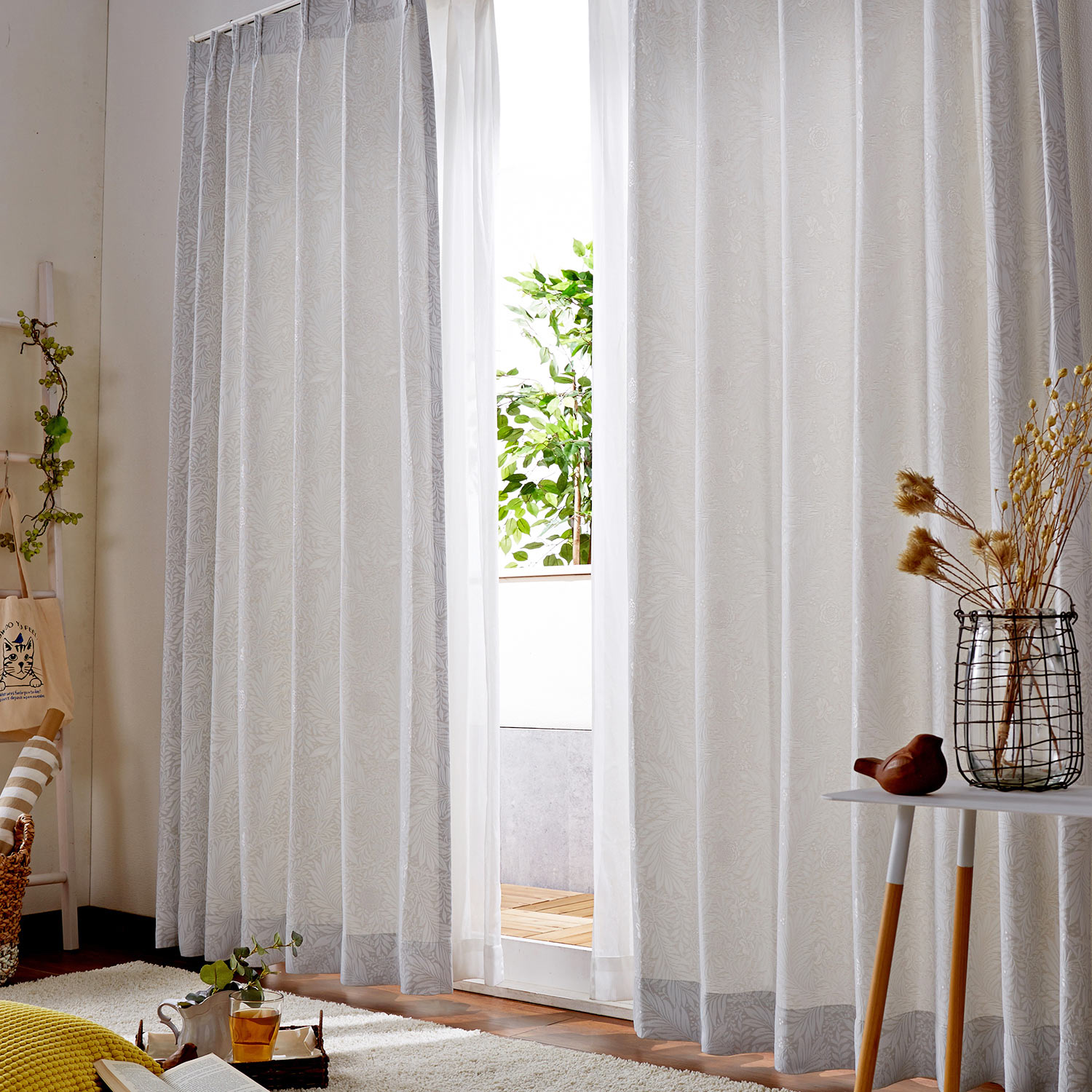 窓から差し込む光を拡散して、お部屋の中を明るく見せてくれる採光ボイルカーテンですうれしい「UVカット機能」や、プライバシーを守る「遮像機能」で、真夏や人通りが多い道沿いでも快適な暮らしを守ってくれます。小花をサークル状に配した「シオンシルエット」、ボタニカル柄をライン状にあしらって木陰にいるような感覚になれる「ノハラシルエット」、リーフやお花の2色からセレクトしてそれぞれ驚きの99サイズでご用意しているので、オーダーでないと合わなかった腰窓や大型の窓も、ぴったりサイズがきっと見つかるはず