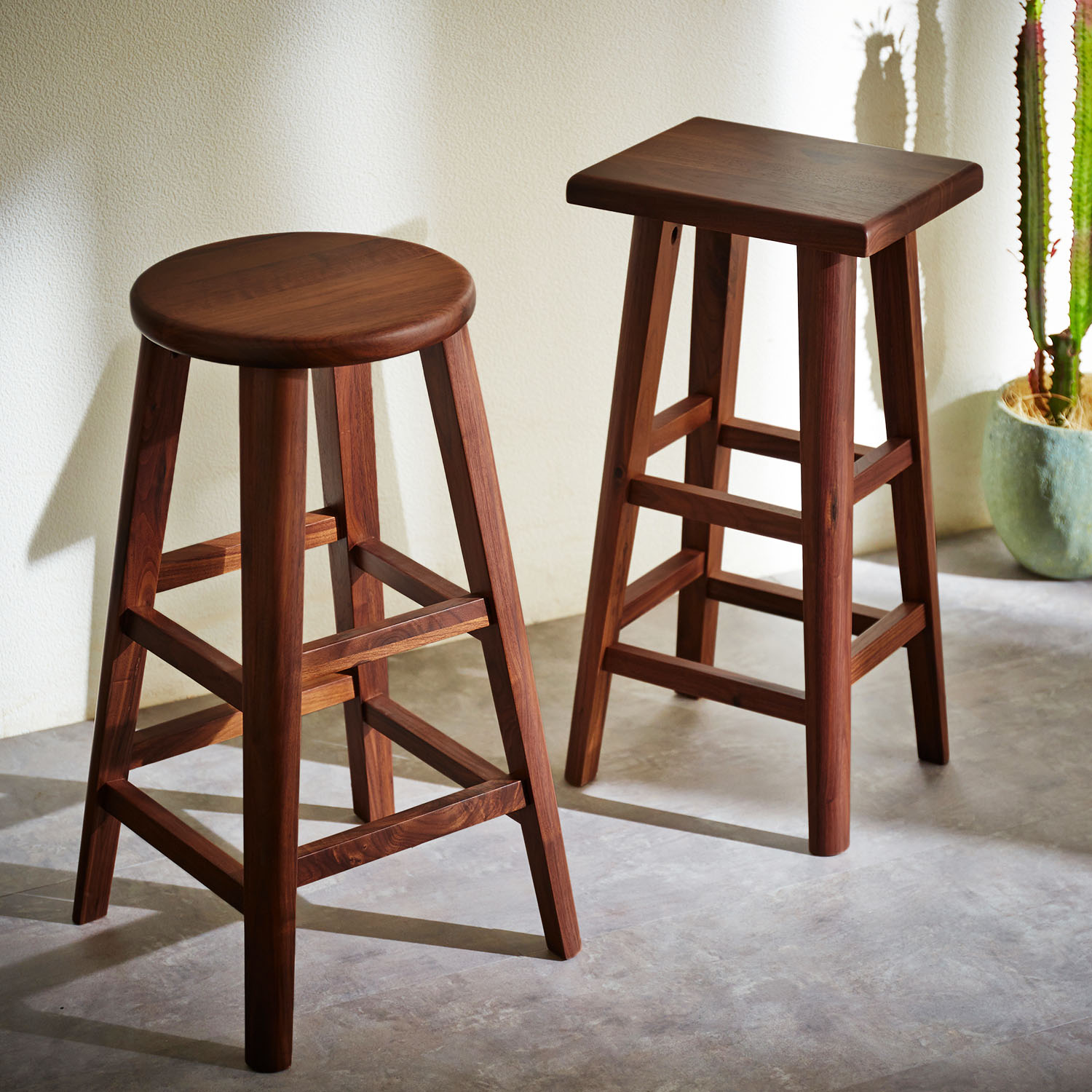 美しい木目と落ち着いた雰囲気が魅力のウォルナット無垢材を使用シンプルな中に高級感を漂わせる、おしゃれなデザインのハイスツールです腰掛けやすい高さはカウンターテーブルと合わせるのはもちろん、キッチンや玄関など幅広いシーンで大活躍足置き付きなので、安定して座れるのも使い勝手のいいポイントです印象の違う座面は、「丸座面」と「角座面」の2タイプから、お好みでどうぞ