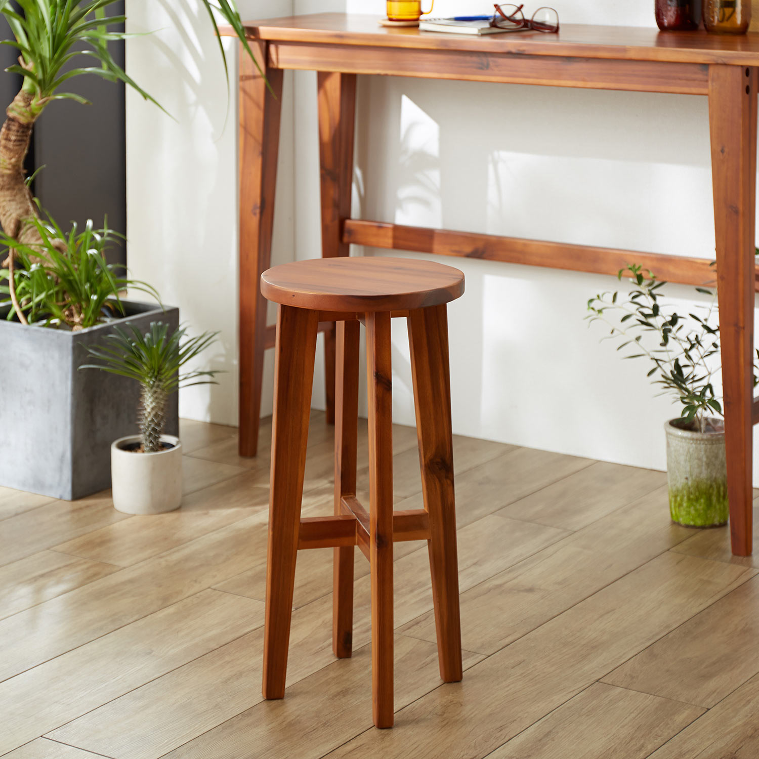 アジアンテイストな表情を見せるアカシア材を贅沢に使用木質感を楽しめるシンプルデザインのハイスツールですストンと真っ直ぐに落ちた脚部で印象はすっきり圧迫感を与えにくい丸座面もデザインのポイントシンプルなデザインはどんなインテリアにもしっくりなじみます。シリーズのカウンターテーブルと揃えるのもおすすめお求めやすい価格にも注目です