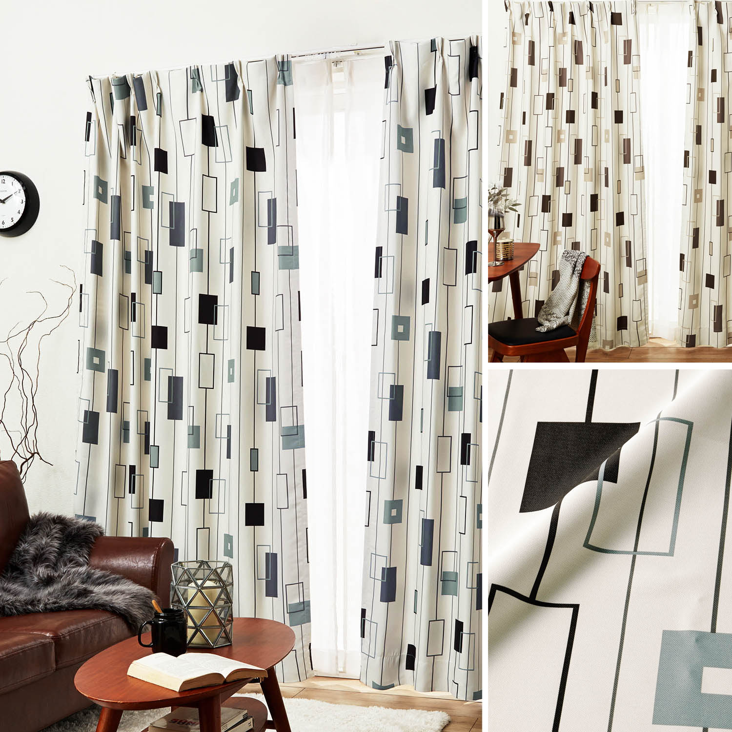 モダンでシックな色合いで描いた、モチーフやラインデザインがおしゃれしっかい光を遮ってくれる遮光機能付ウォッシャブル仕様で清潔に使え、形状記憶機能付きでドレープを美しく保てるのが特長のカーテン