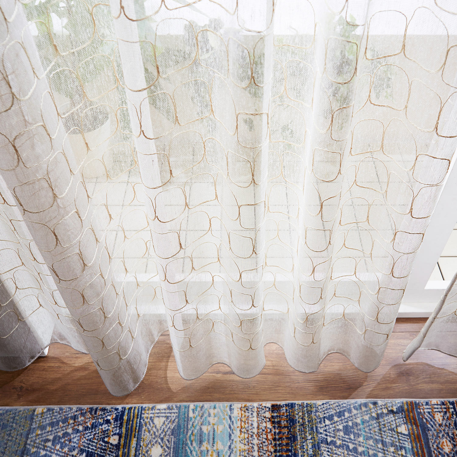 北欧モダンを思わせるスタイリッシュなレースカーテンやわらかく表情のある生地に、ランダムな四角モチーフを刺繍で表現しました刺繍には光沢のある糸を使用し、光のあたり方でニュアンスが楽しめます