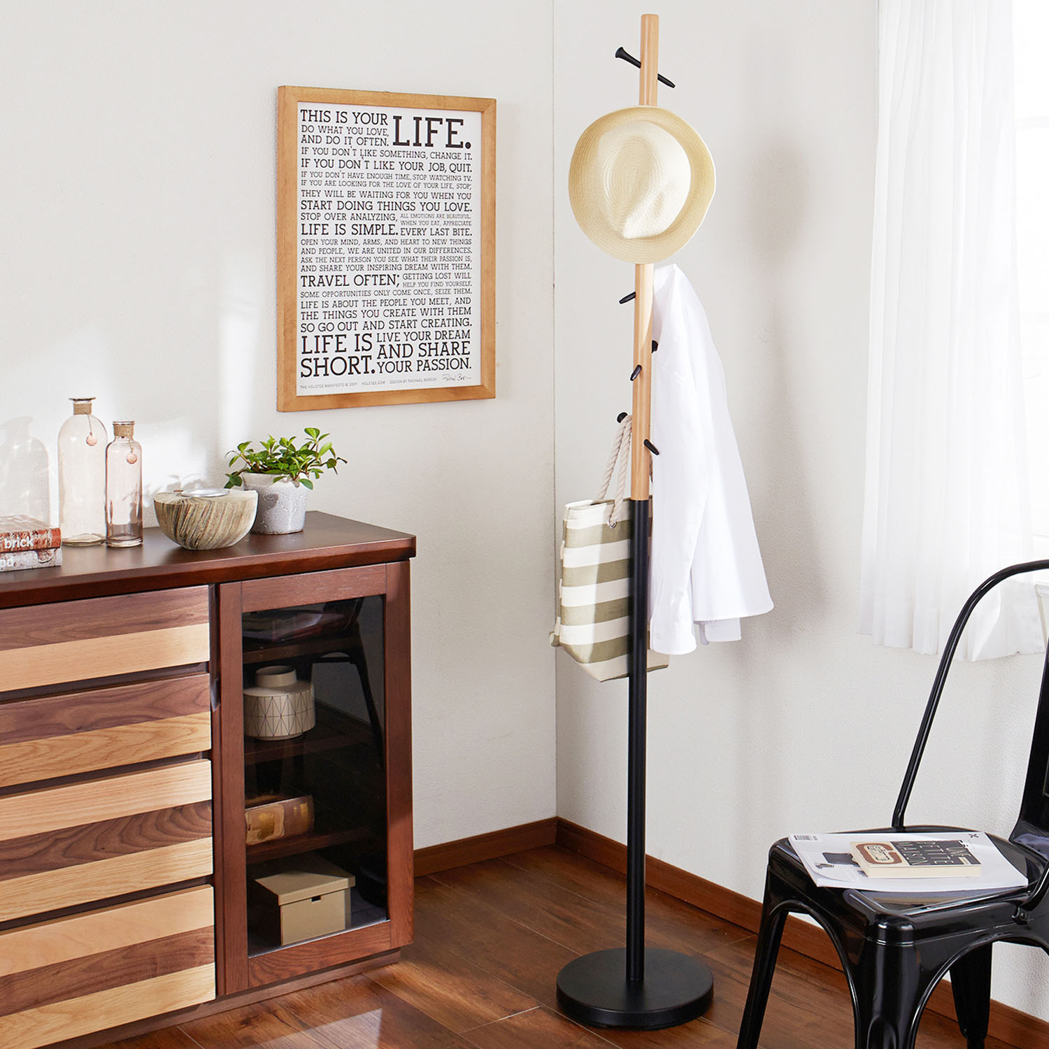 ブラックスチール×木目のツートンカラーでおしゃれに仕上げたポールハンガー樹木をイメージさせるシルエットのハンガーに、コートやカバン、帽子などをサッと掛けておけます。落ち着いたカラーリングがシックな大人のインテリアにマッチ)
