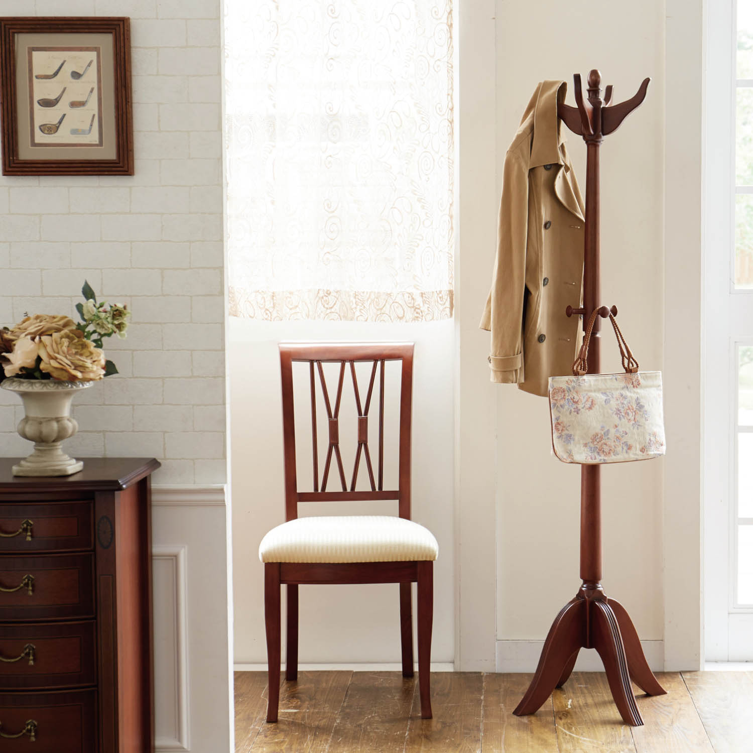 高級木材として世界的に知られるシックなマホガニー材のポールハンガー。花が咲いたようなクラシックスタイルのデザインで、コートなどの他にバッグも掛けられます。どっしりと落ち着いた重量感があり、ぐらつかず倒れにくいのも特長。)