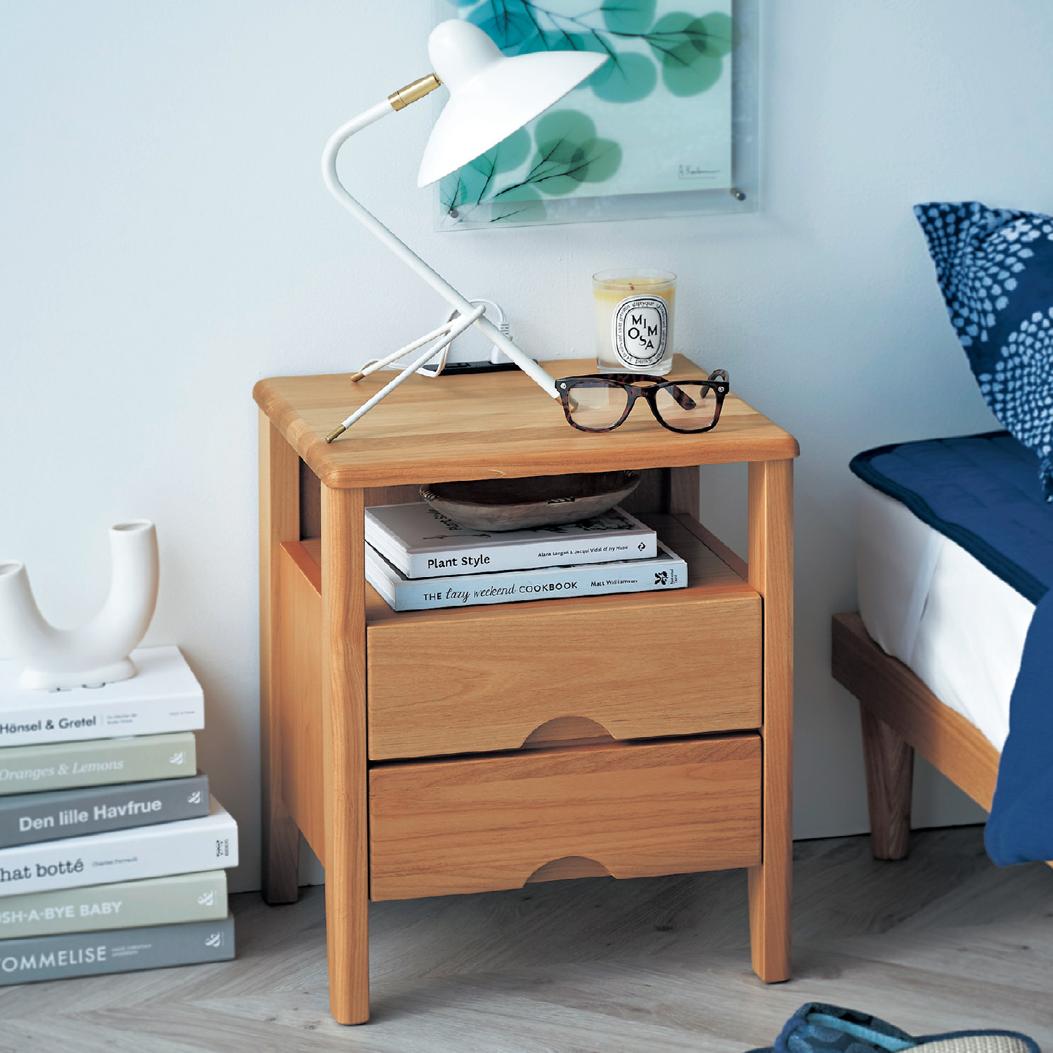 アルダー材の引出し & コンセント付きベッドサイドテーブル