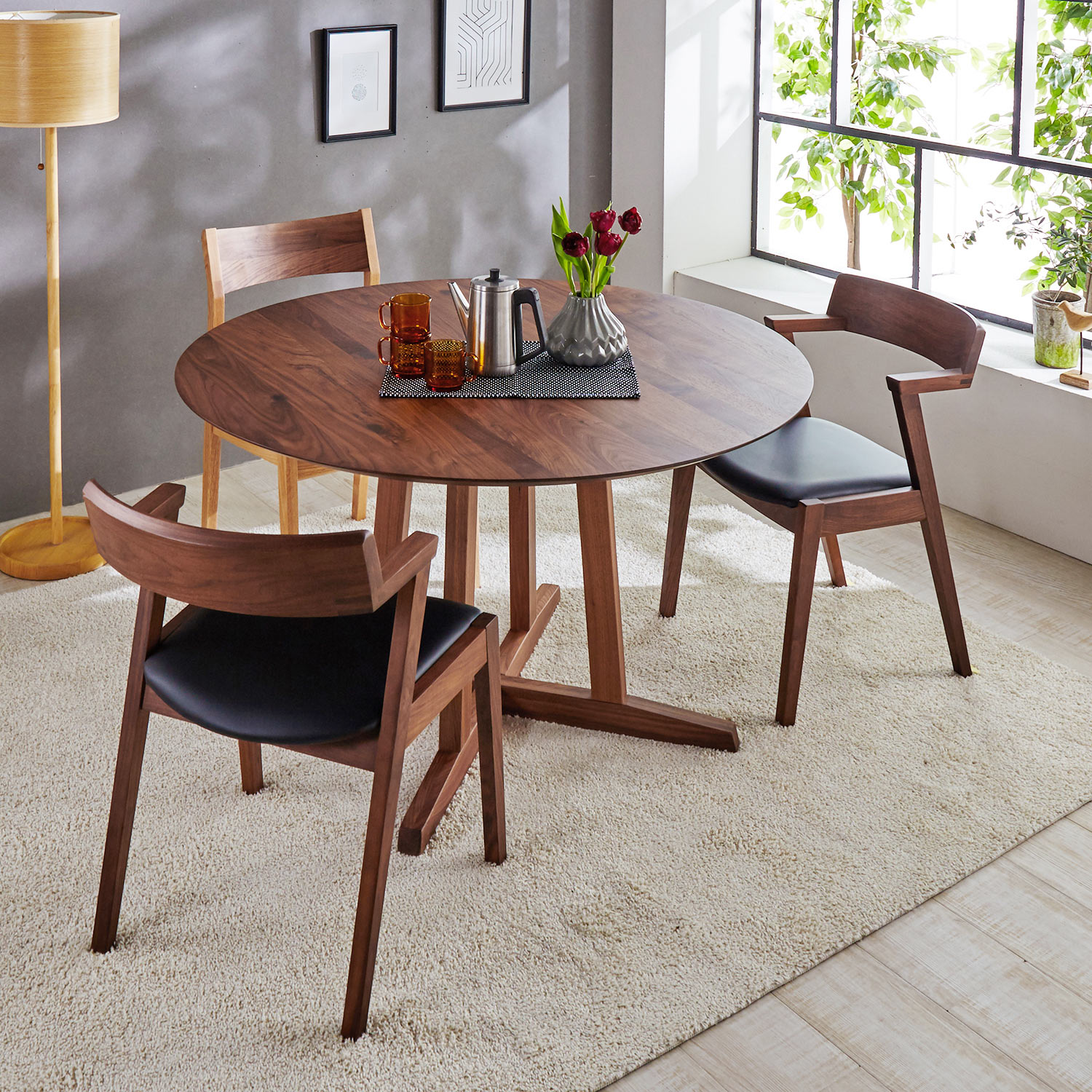 木目が美しいウォルナット材の円形ダイニングテーブル