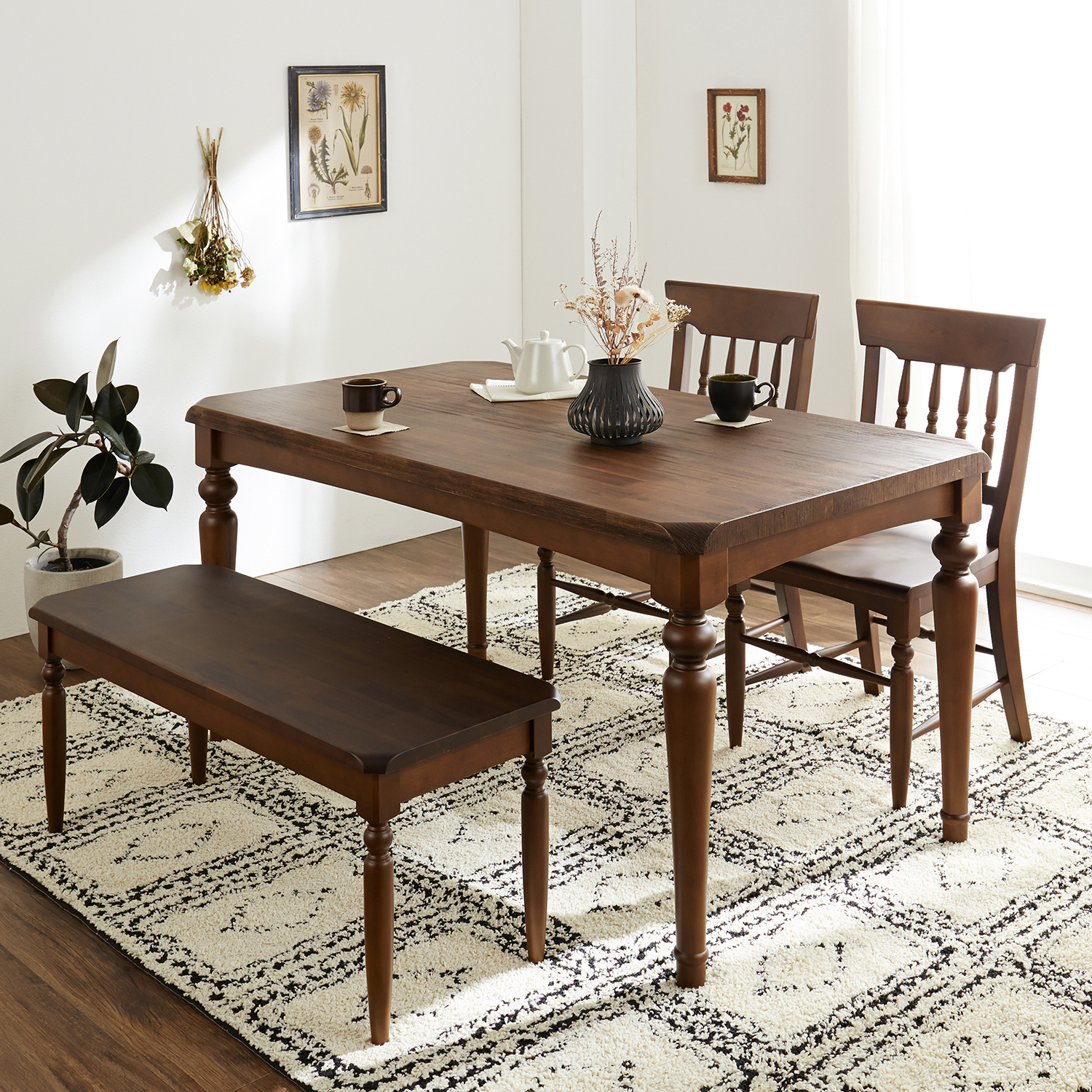 落ち着いた色味のアカシア材を天板に使用した、シックな雰囲気ただようダイニングテーブル木目を感じられる浮造り加工の天板や、ろくろ調脚のクラシカルな趣が高級感のある空間へと演出してくれます。4人掛けの幅140cmと6人掛けの幅180cmをご用意しました