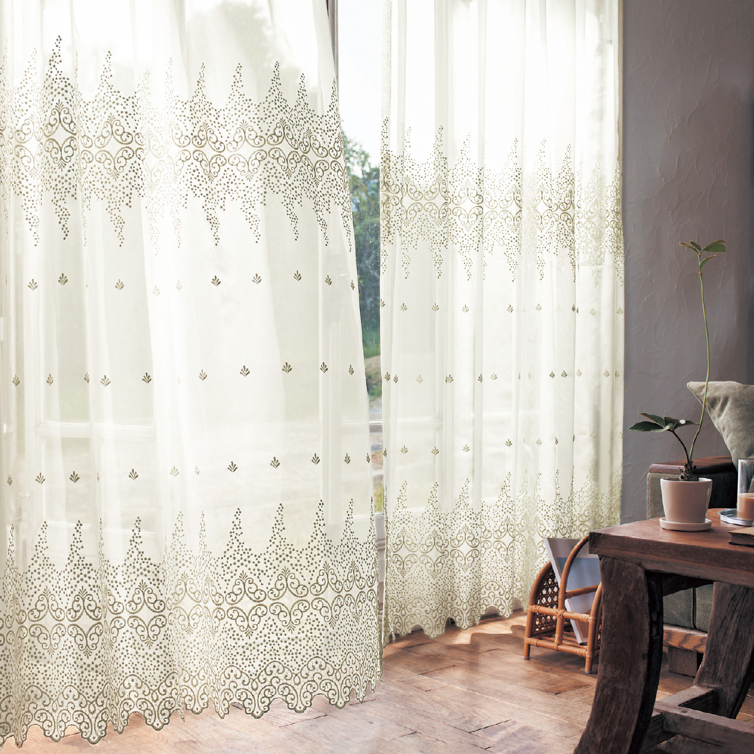 繊細なトルコ刺繍が目を惹くレースカーテン光沢糸でスミレモチーフを表現した、まるでウェディングベールのような素敵なデザインが窓辺を愛らしく演出してくれます。裾の両サイドにはウエイトを入れ、ストンと落ちるシルエットの美しさもポイント