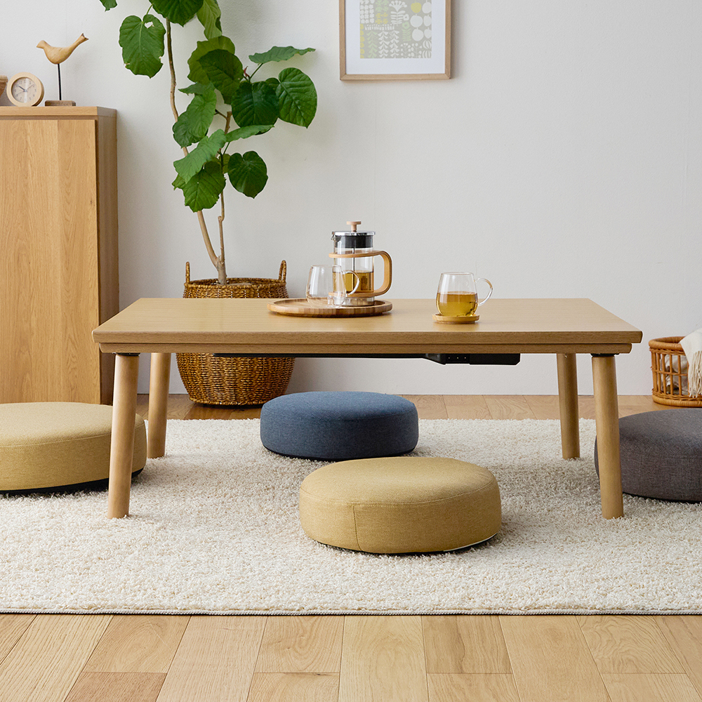 ベルメゾン継ぎ脚仕様なので、高さを調節できるのもポイントですヒーター部には、即暖性に優れたハロゲンヒーターを採用手元で温度調節ができるコントローラーは、オフシーズンには天板下に収納できます。リビングテーブルとしてオールシーズン活躍します。