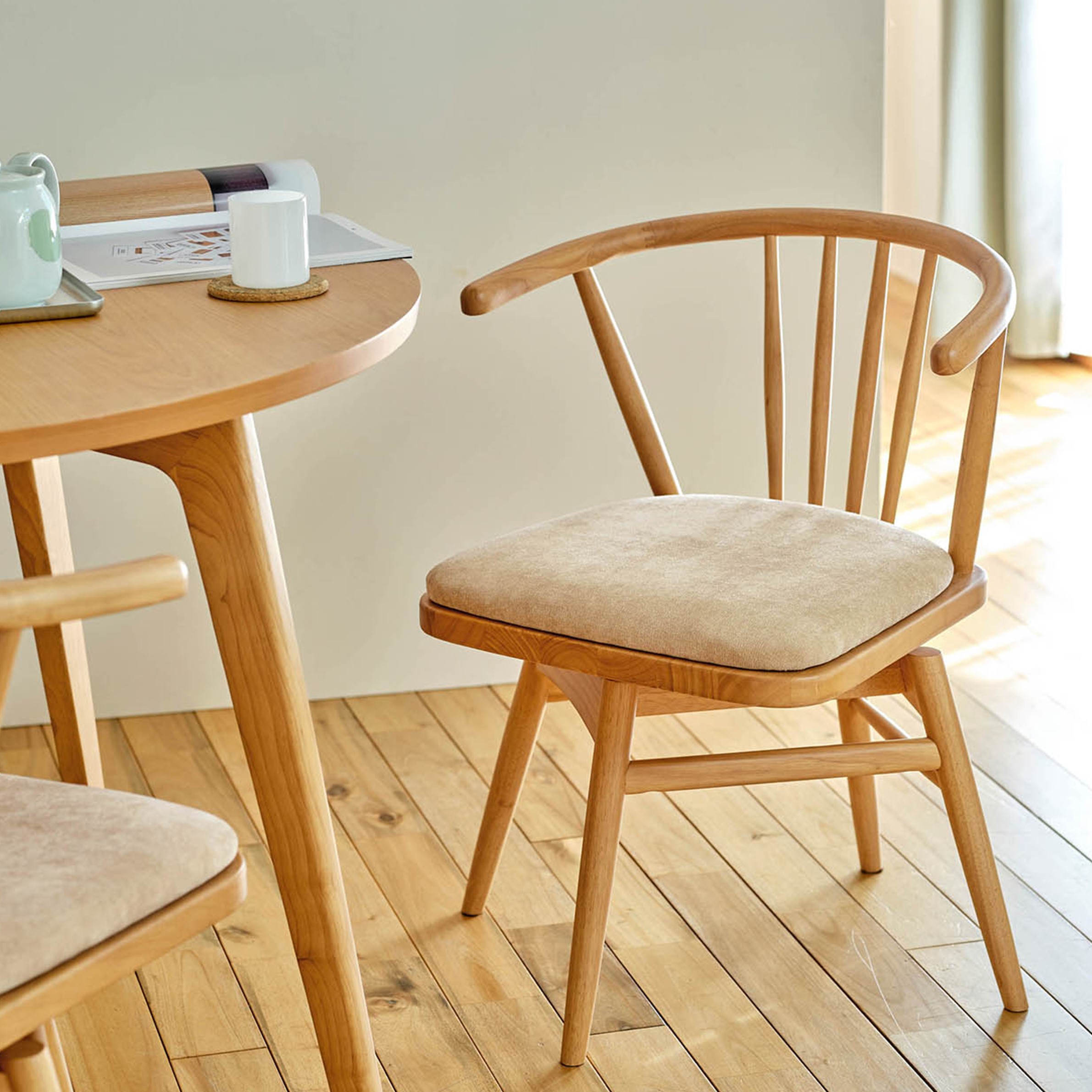 曲げ木で仕上げたやわらかな表情と、抜け感のある背面デザインが特長身体を包み込むように配した背もたれは、ハーフサイズの肘掛けとしても使えるから、立ち座りはラクチン