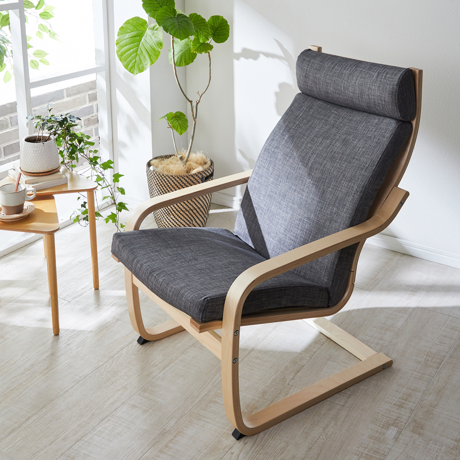 曲げ木による自然なロッキングで、心地良く座れるパーソナルチェアハイバックで、頭部もクッションが付き身体を預けてくつろげます。背面から見てもスタイリッシュなデザイン曲げ木のフレーム構造で、背もたれが柔軟に動くので心地よい姿勢を作れます。張地にファブリック生地を使用しており、年中使いやすい仕様)