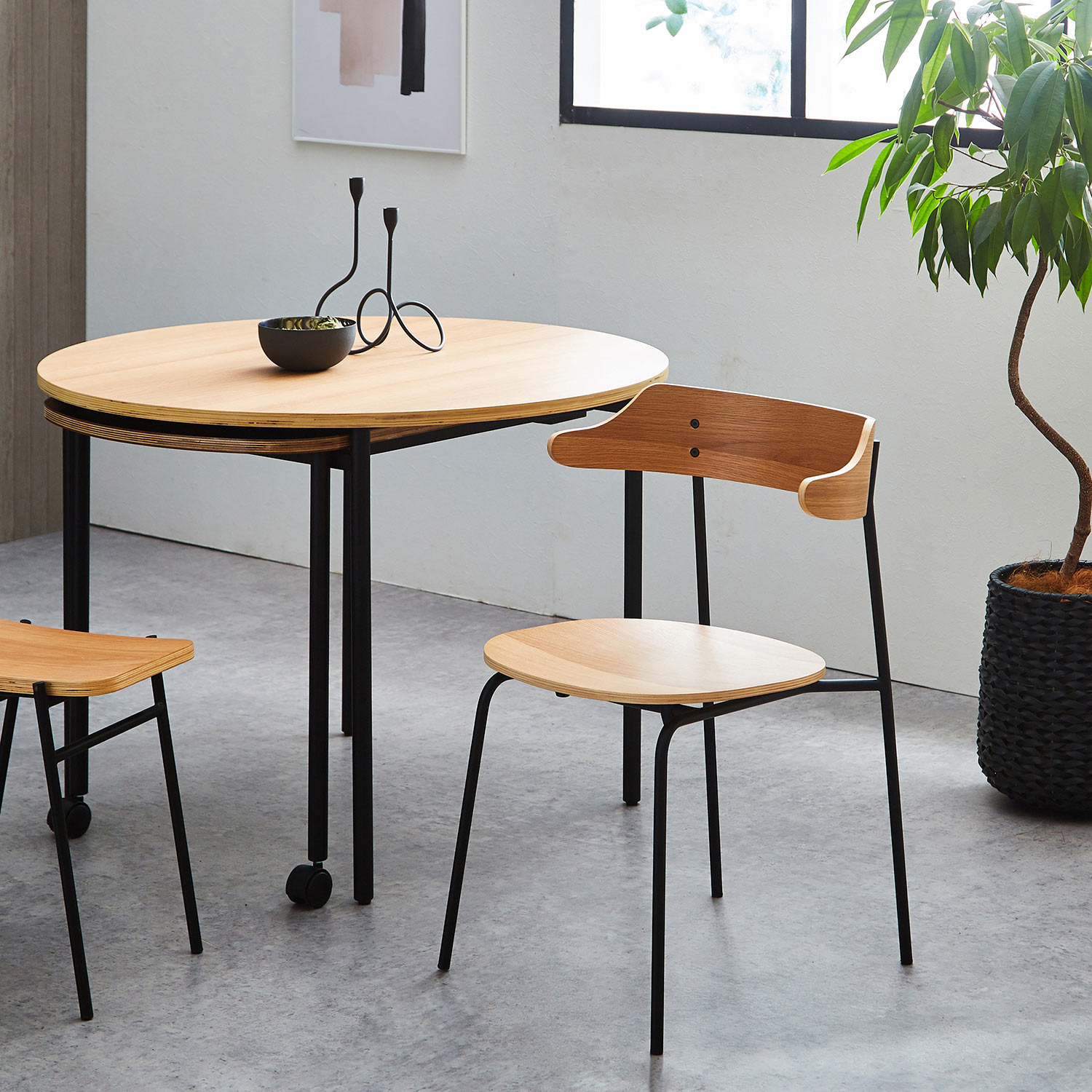 異素材使いがおしゃれなダイニングチェア木部には木目の流れが美しいオーク材を使用しましたスチール脚を合わせたスタイリッシュデザインはインテリア性も抜群ハーフアーム設計で横からの立ち座りはスムーズ「板座」タイプは、木感を存分に楽しみたい方におすすめ「布座」タイプには、グレーのファブリック生地を使用しています。シリーズのダイニングテーブルとのセット使いがおすすめ)