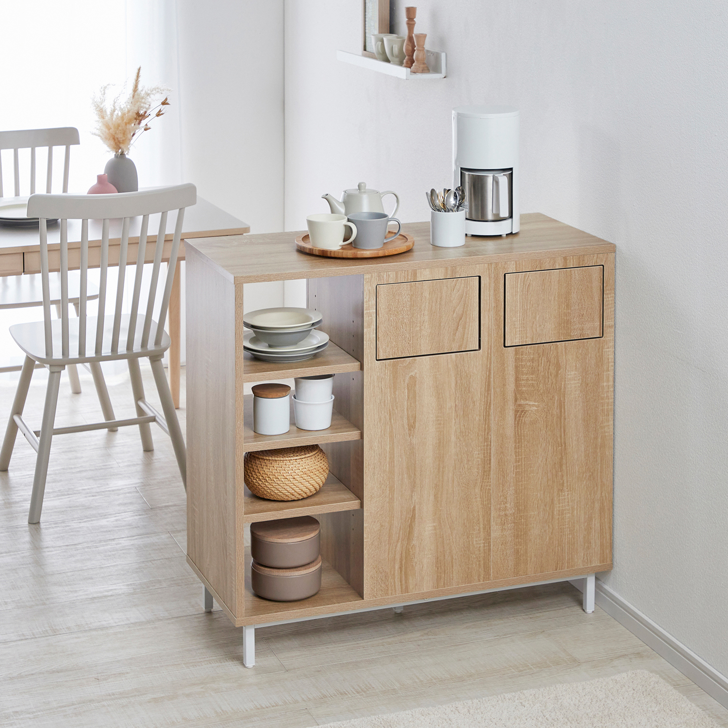 しっかり収納しながら空間の間仕切りができるカウンター天板下にはマガジンラックがついており、お気に入りの雑誌など飾ることができます。裏面の天板下にはBOXを置けるスペースを大量に備え、キッチン周りの小物などお好みで仕分けて収納できる仕様
