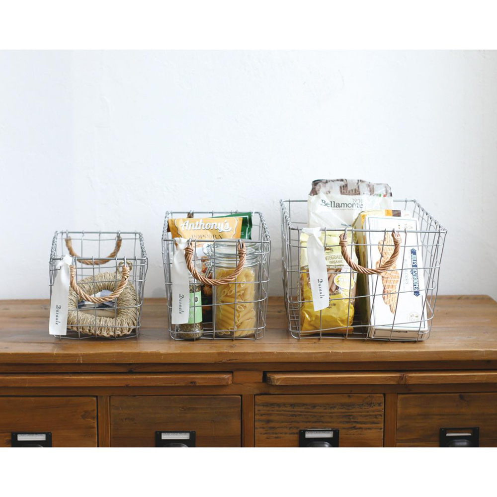 統一感のないものでもワイヤーバスケットに入れることでまとまりが生まれ、お洒落なカフェのような雰囲気に。スクエアタイプは広くおさまりが良いので、キッチンやリビングの見せる収納に◎ワイヤータイプのカゴを使って収納すると、必要なものを探す手間が省けます。バスケットの左右にハンドルが付いているので持ちやすく、お部屋間の移動もラクラク。