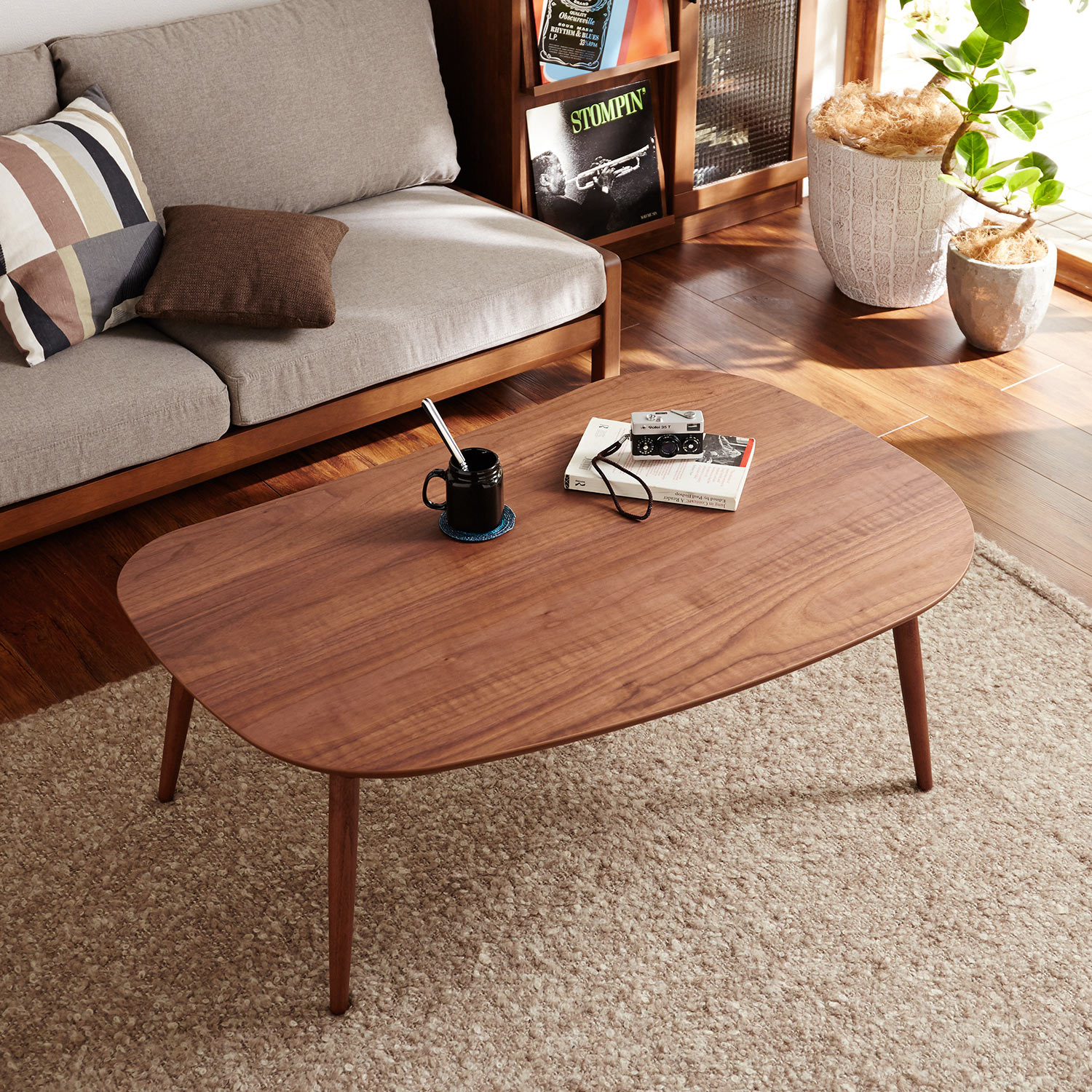 天板にウォルナット材突板を使用し木目の風合いを存分にお楽しみいただけます。変形デザインで角を無くしたオシャレなデザインは優しく柔らかな印象脚部には天然木ビーチ材を使用し、スッキリとした先細りのデザインを採用脚部の印象をスッキリさせることでお部屋に圧迫感を与えずかろやかオフシーズンも違和感なくリビングテーブルとして使用できます。遠赤外線でじんわりとあたためるカーボンヒーターを採用手元コントローラーでON/OFF操作もラクチン置くスペースに合わせて選べる2サイズ展開インテリアで差をつけたい方に必見です国内工場で製造した日本製商品です