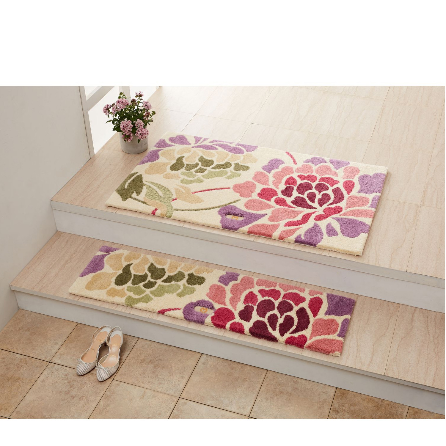 蓮の花柄を繊細に表現した、ミラ・ショーンの玄関マット糸をループとカットを使い分けて、毛足の長さで柄を表現しました多色使いで花びらの細部まで織り上げた、日本製ならではのクオリティー裏面はすべにくい加工をほどこしています。