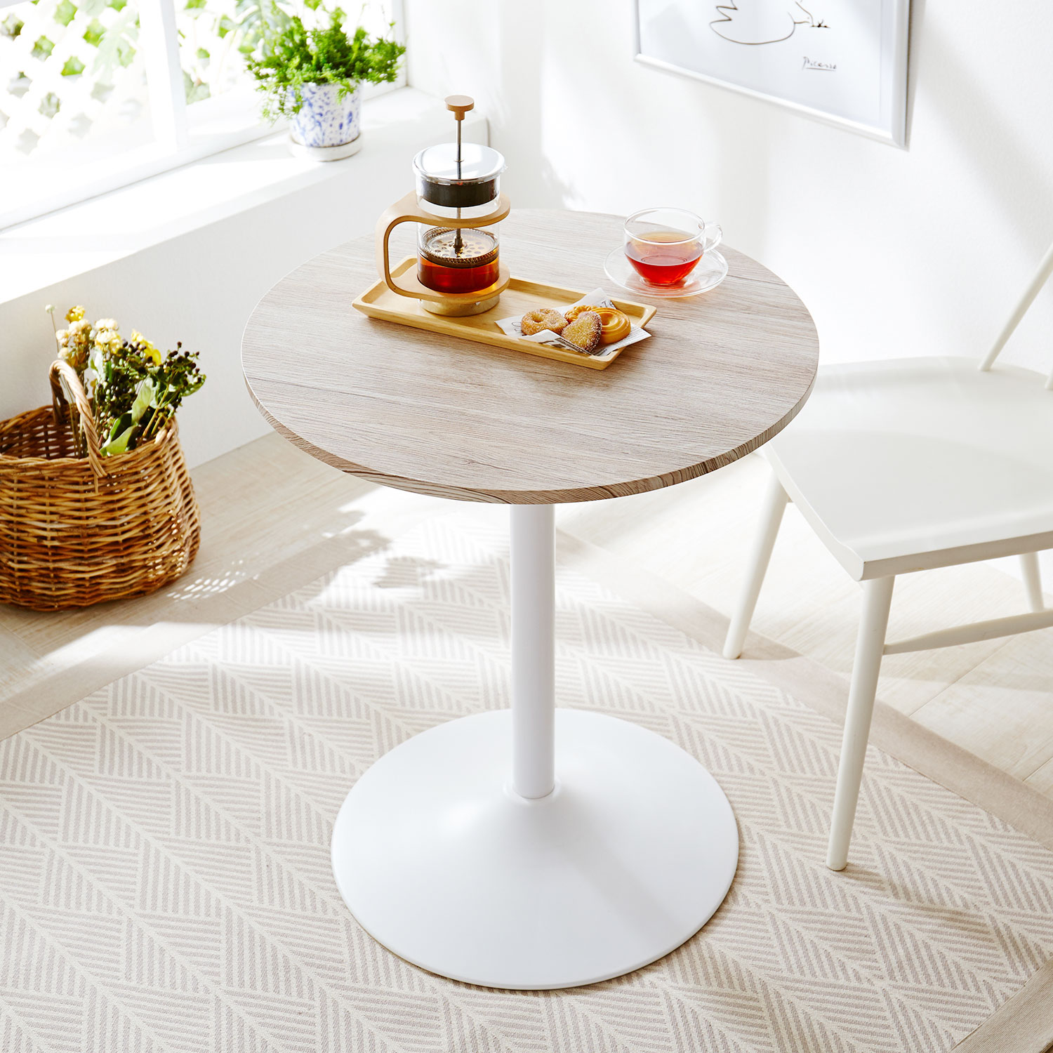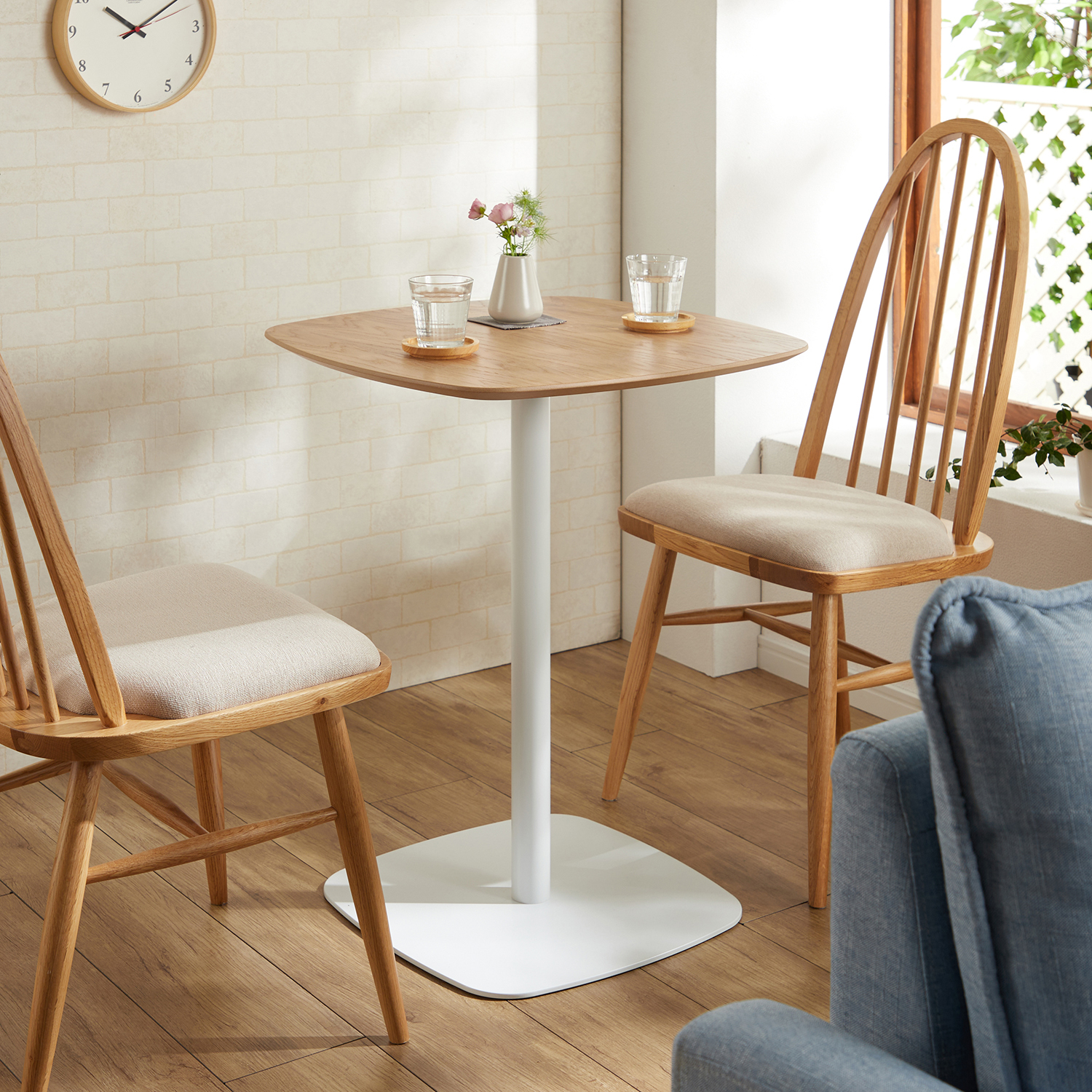 小振りのカフェテーブル。お一人暮らしのコンパクトなダイニングテーブルとしてもピッタリオーク材の天板に優しい色味のスチール脚の組み合わせが映えておしゃれ