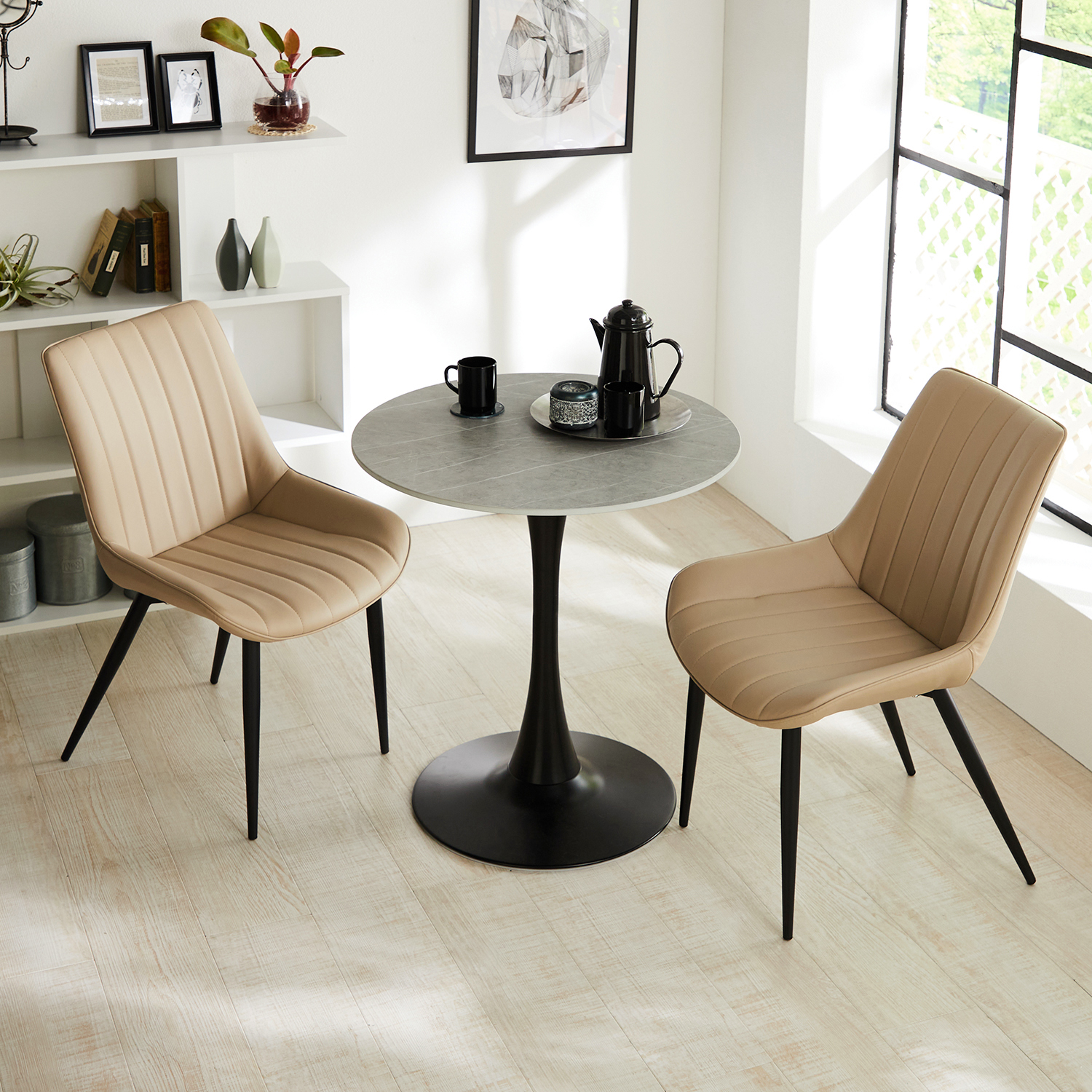 まん丸のテーブルは2人用に向き合わせて使うレイアウトをよく見かけますよね