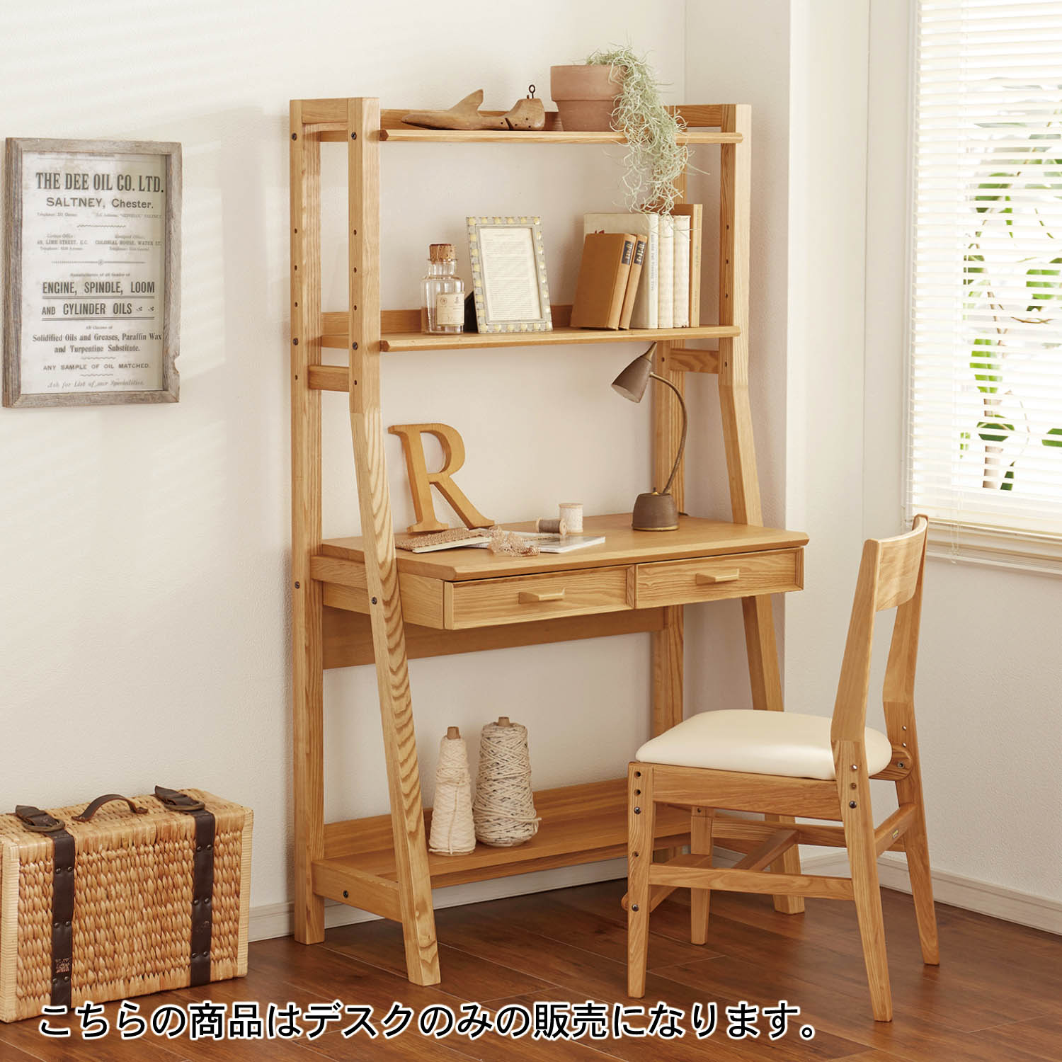 天然木のタモ材を使用したラック付きデスクは、自然な風合いとぬくもりのある質感が魅力使うほどに味わい深くなっていくのも楽しみですリビングやワークルームでも置き場所を選ばないコンパクトなサイズお子様の学習机としても使え、シンプルナチュラルなデザインなので成長してもずっと使えます。本や雑貨を収納できる棚は5段階に高さを調節できます。こまごましたものを整理できる引出しも2杯付いて便利足もとにも棚板が付いています。#PCデスク#テレワークデスク
