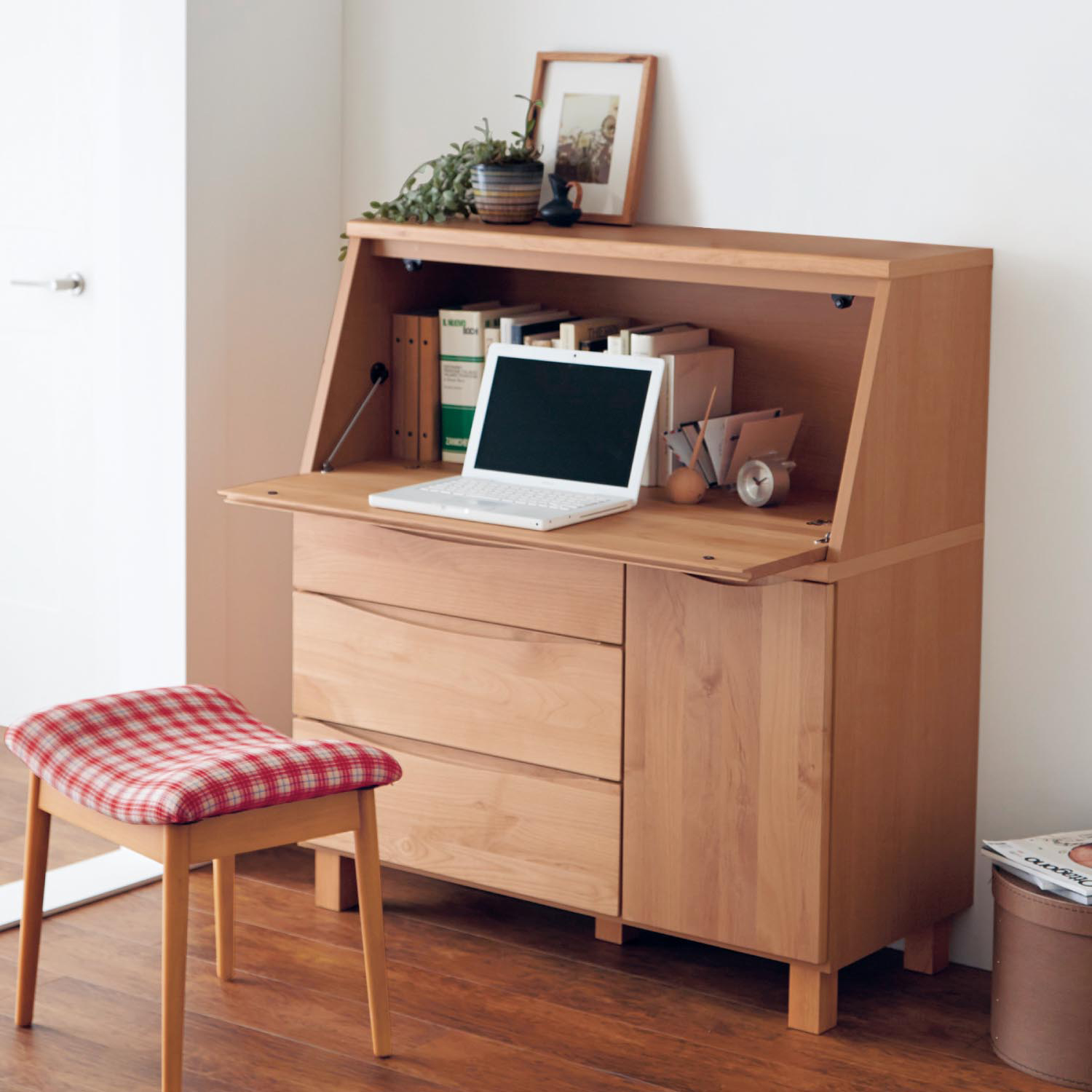 前板には温もりの感じる天然木アルダー材を使用天然木ならではの掘り込み取っ手がデザインポイント広々としたデスク面で作業がしやすくテレワークにもA4サイズのパソコンなら、そのままデスクを閉じて収納できます。扉内には可動棚1枚とコード穴付きルーター等を隠しながら設置できます。