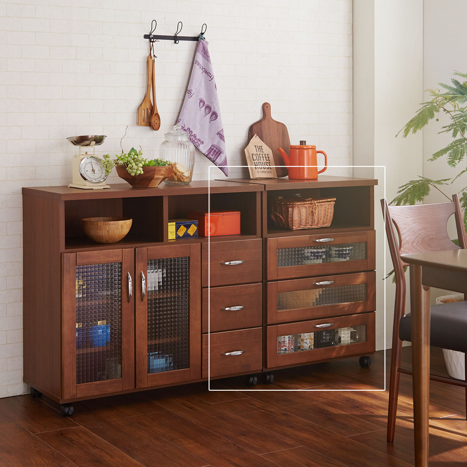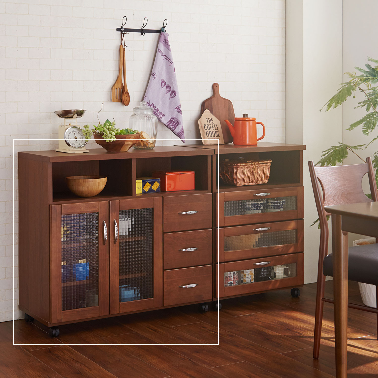 柔らかな表情をもつ天然木パインの無垢材を前面に使用した、カントリー調のおしゃれなキッチンワゴンオープン部2部屋に可動棚2枚を備えた両開きのガラス戸収納、小物類を整頓できる3杯の引出しと、たっぷりの収納力を備えています。ガラス部分はクロスガラスを採用しているので、中の物をほんのり隠しながら適度な抜け感を演出また、脚元がキャスタータイプなので移動させる時もラクチン。