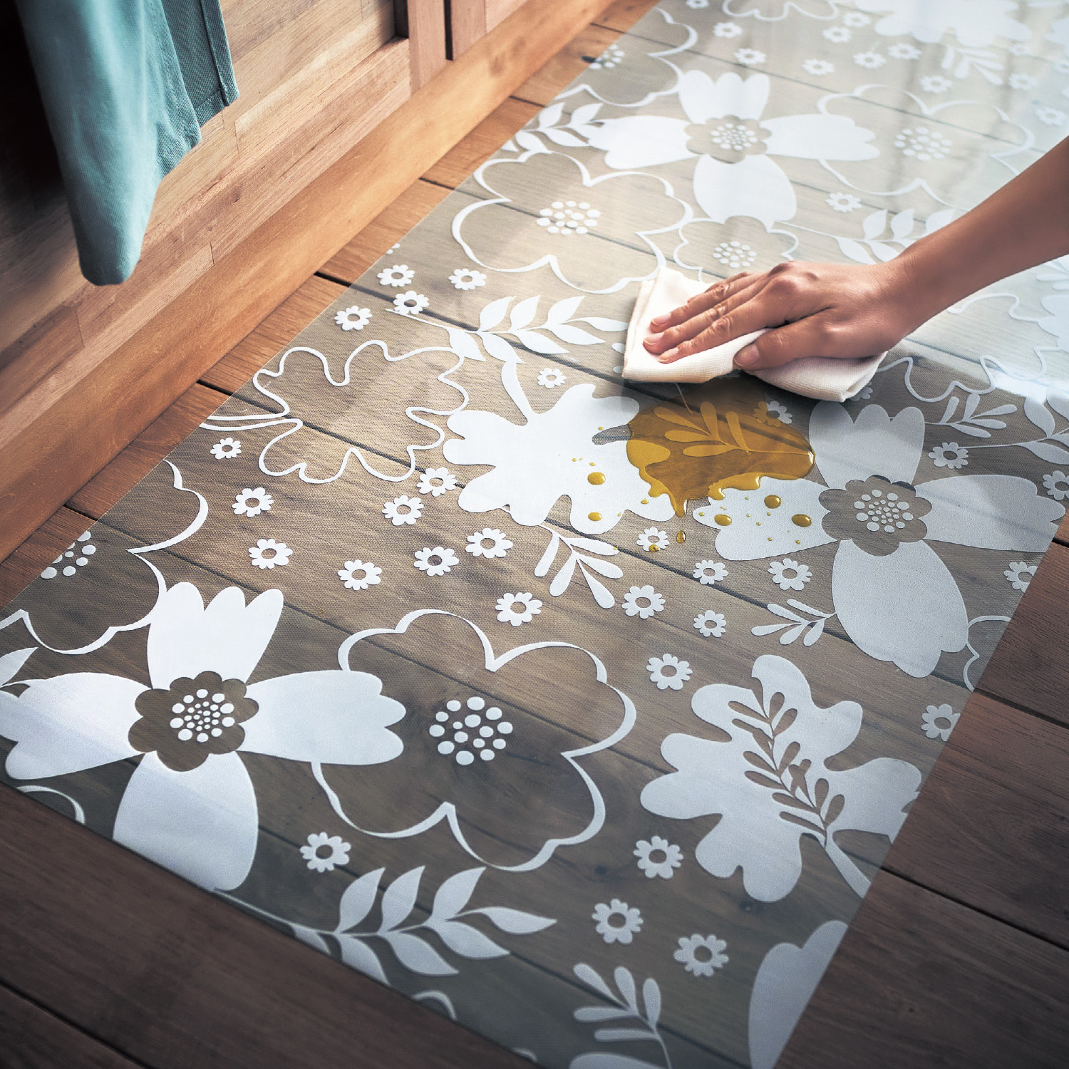 キッチンのシンク前やレンジ台前にぴったり水分や油汚れが染みこまない塩化ビニル製拭くだけで簡単にきれいに清潔感のある透明素材に映える花柄をチョイス敷く場所に合わせてハサミで簡単カットゴミが溜まりにくい厚さにもこだわり