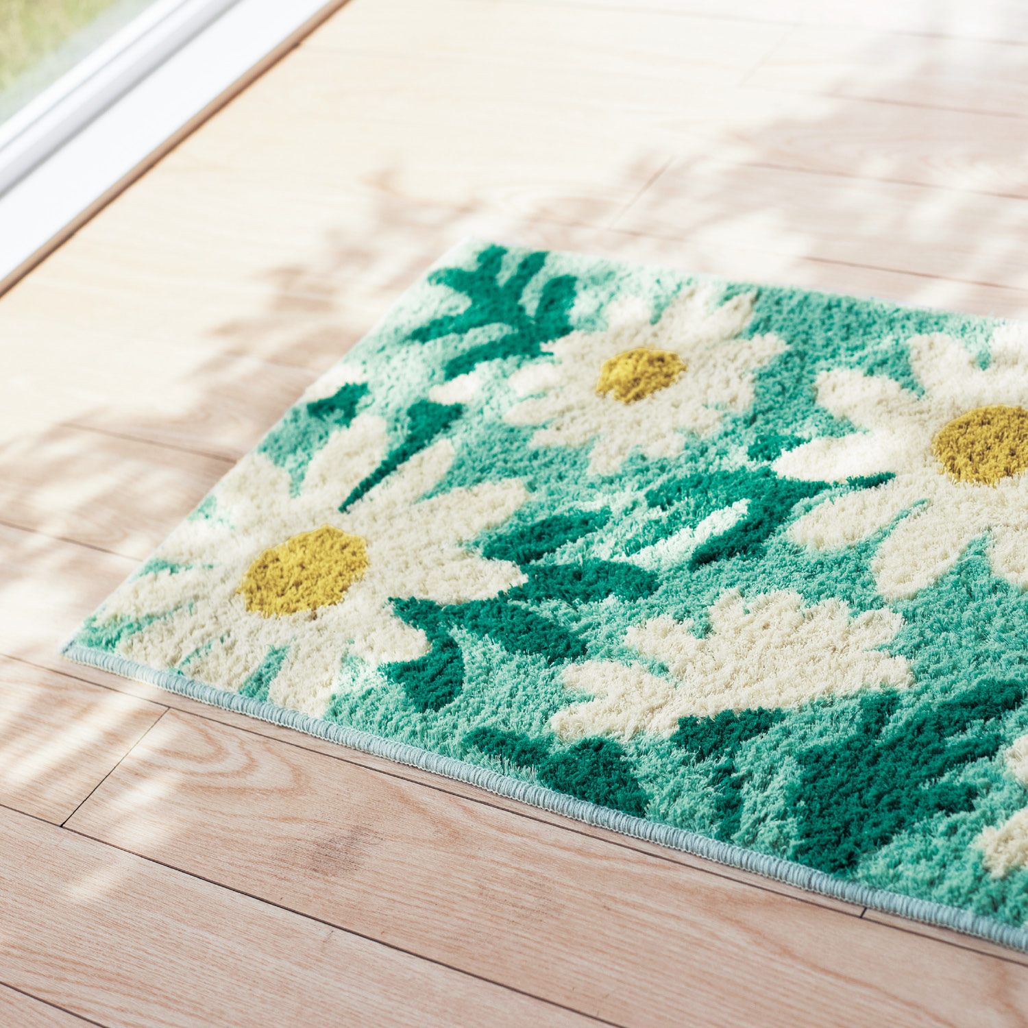 ーデザイン・スタイリングー・ペパーミントグリーン×ホワイトが爽やか・マーガレットの花でナチュラルな雰囲気に・甘過ぎないデザインで空間を明るく演出ー素材・機能ー・ふんわりとした綿素材のパイルを使用・裏面はすべりにくい加工