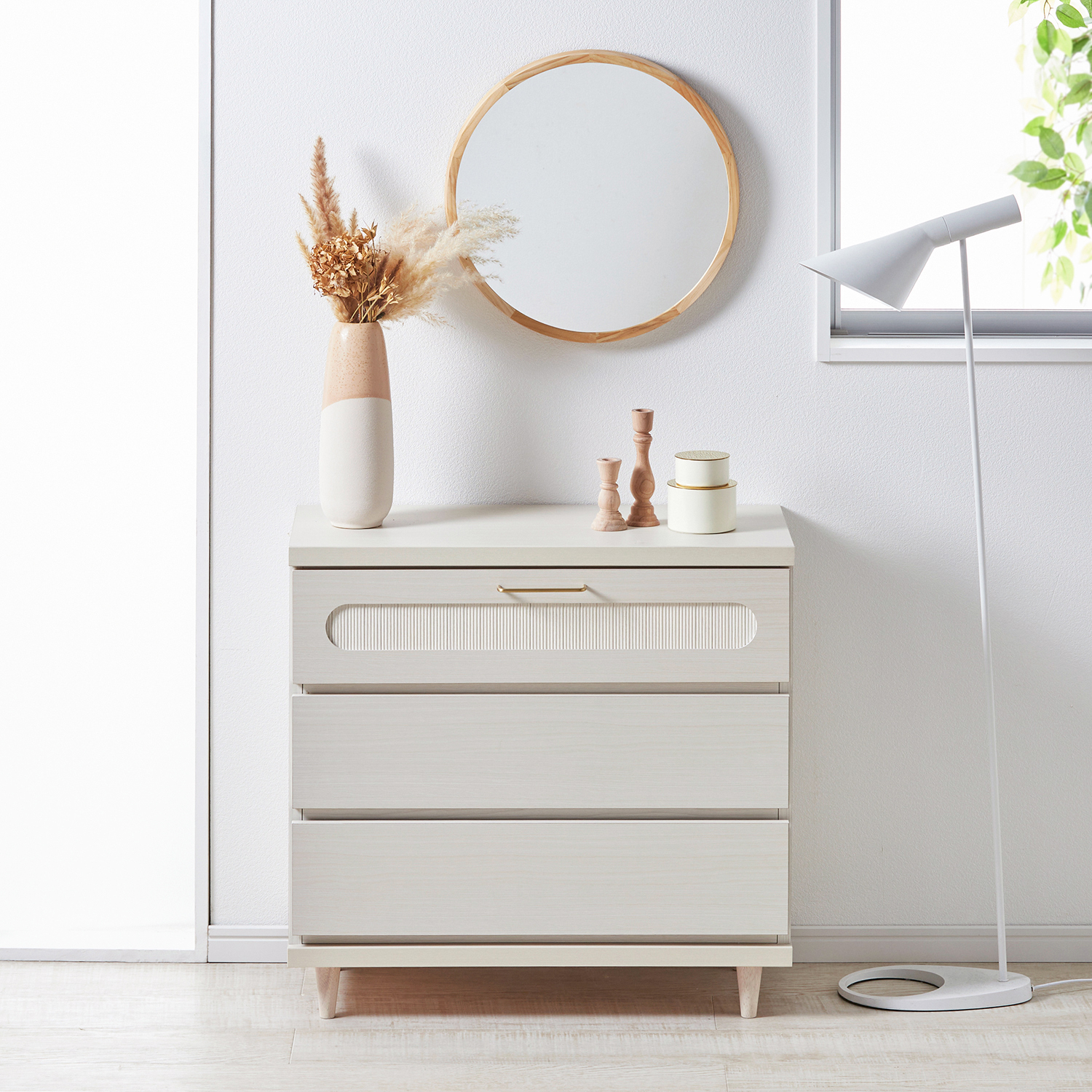 散らかりがちなリビング小物や書類の収納場所に低めの高さで天板上をディスプレイスペースとしても楽しめる下から2段はフルスライドレール仕様で奥のものも取りやすい脚部が巾木を避けてくれるので壁にぴったり設置できます真鍮取っ手のホワイトチェスト[日本製]