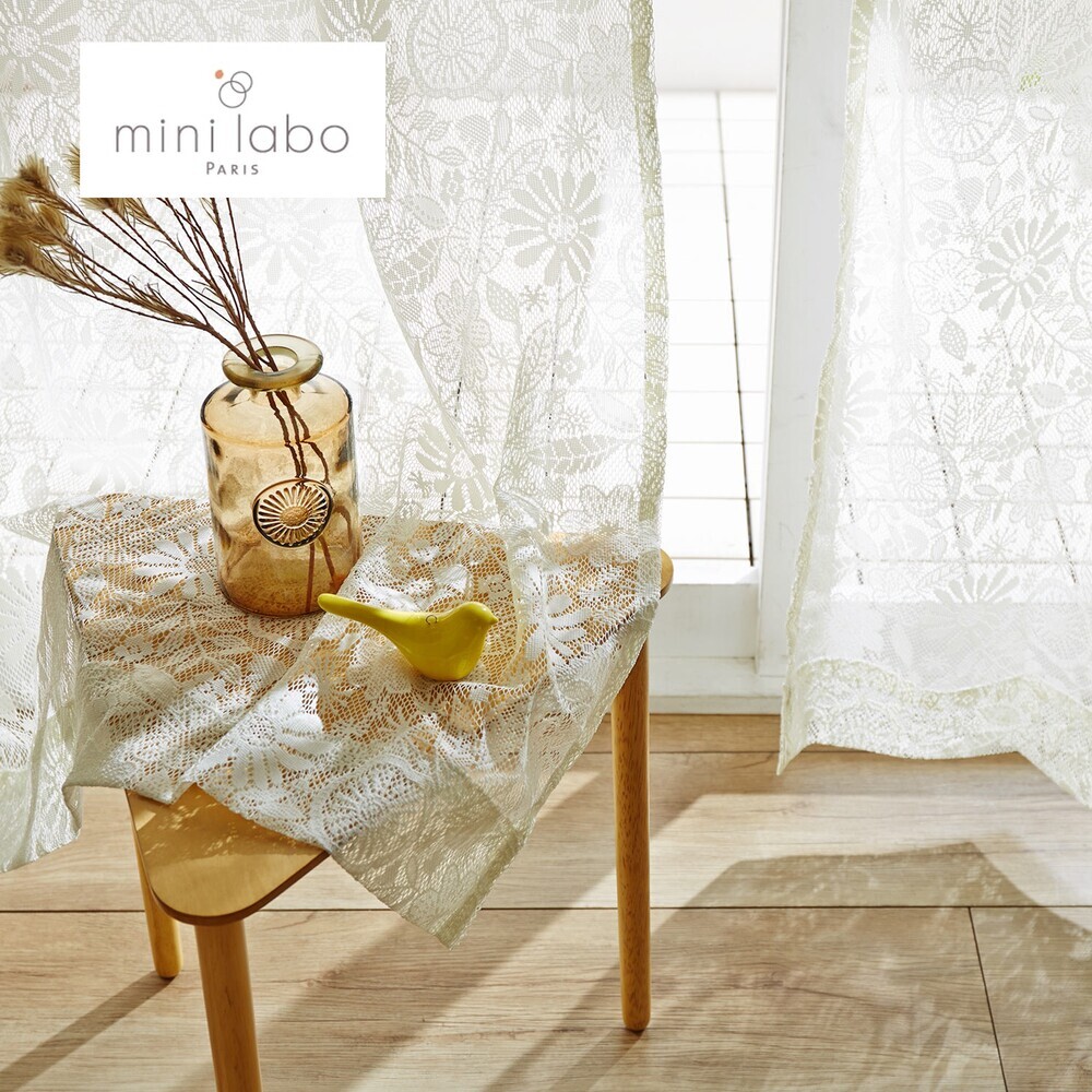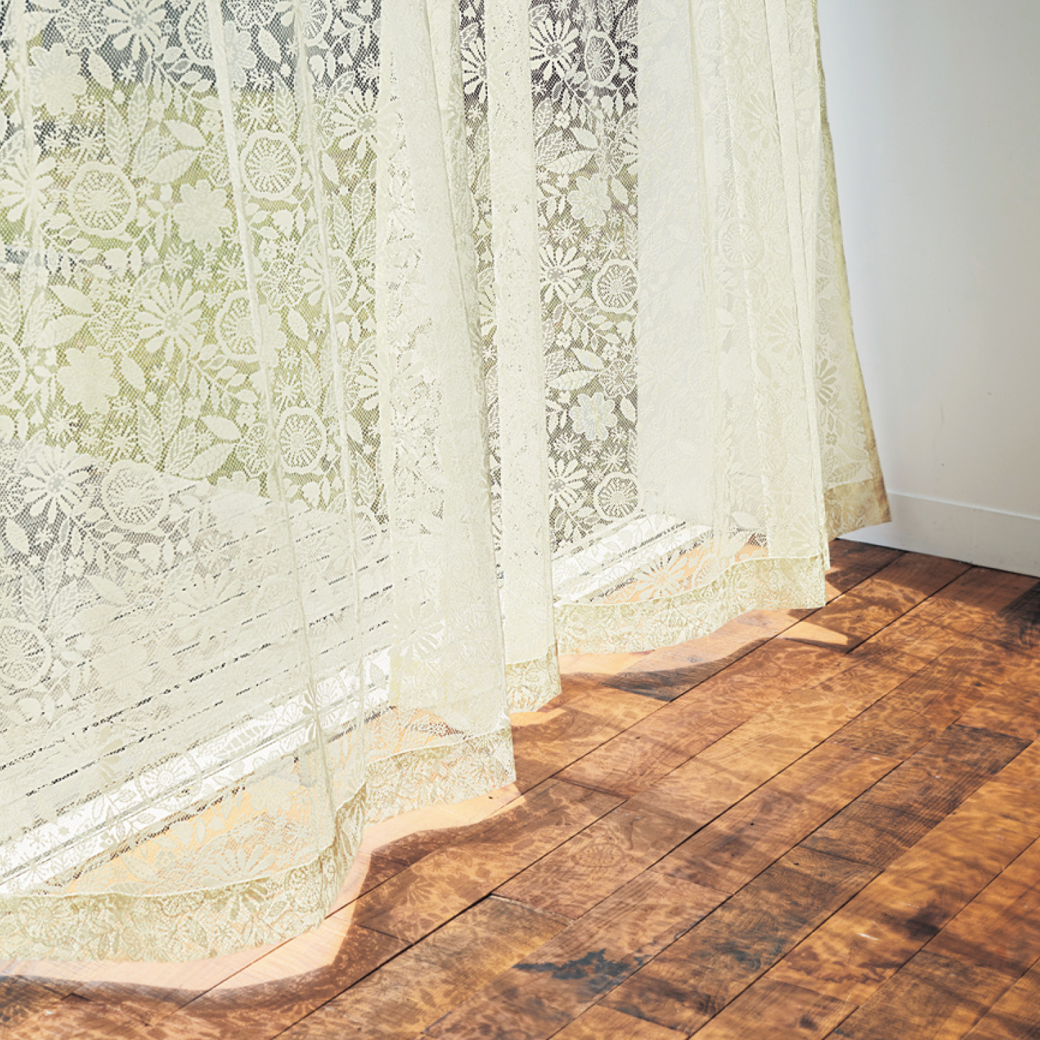 mini laboのデザインの中でも人気が高い『刺繍のようなお花畑』。カラフルではなく、一色で表現されたレース編み柄デザインが新鮮。繊細な花柄と透け感が美しいレースカーテン透け感のあるレース柄で、光や影を楽しめるナチュラルな風合いのレースカーテン安心の日本製