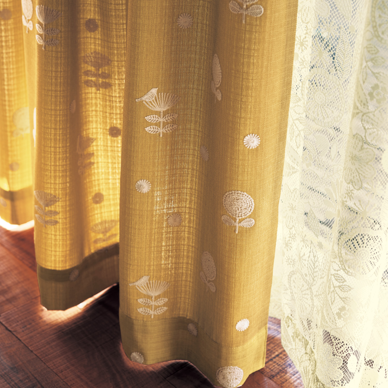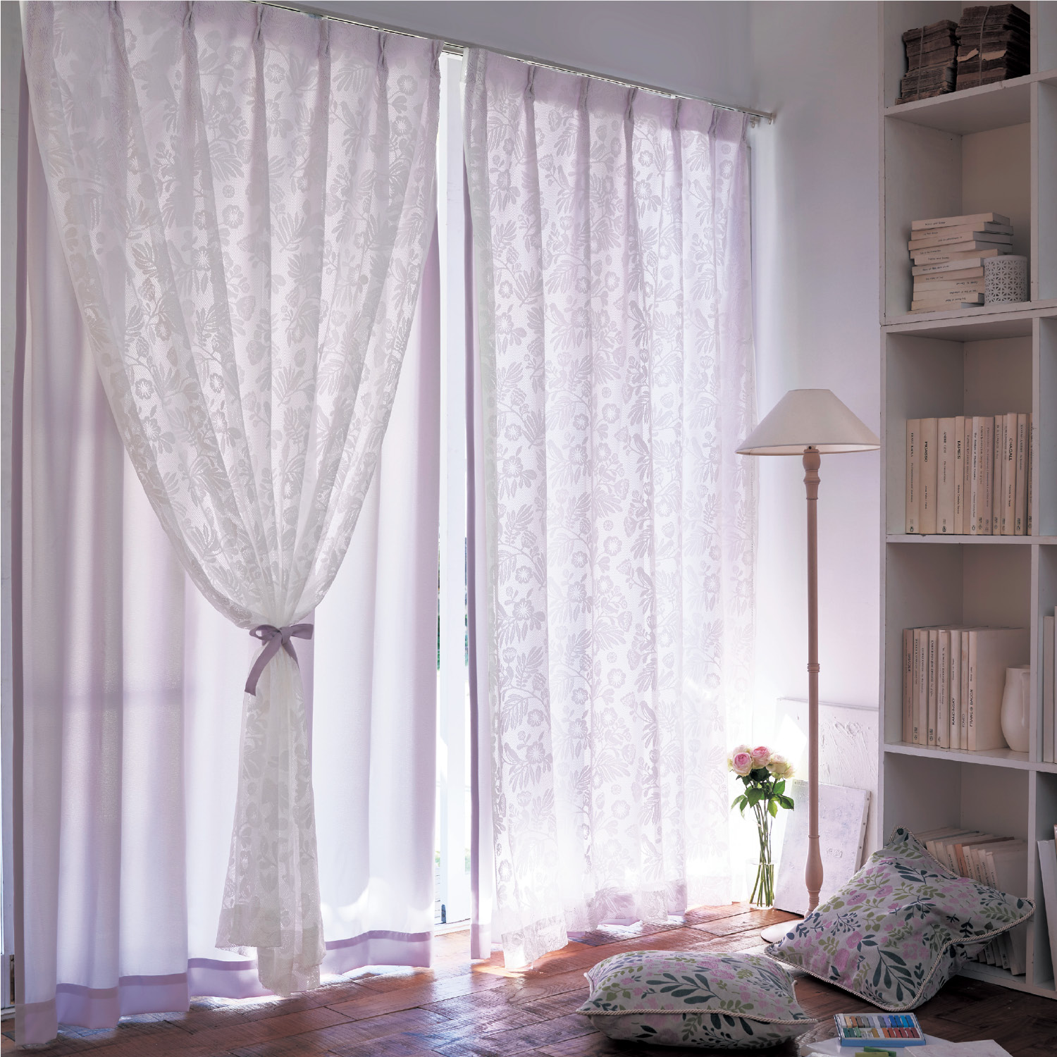 ーデザイン・スタイリングー・無地に花柄のレースを合わせた2重カーテン・昼の光でレース柄が美しく際立ち、夜の表情も印象的・付属のリボンでスタイリングのアレンジも楽しめるー素材ー・無地はしっかりした厚地・レース地は透け感のある薄地