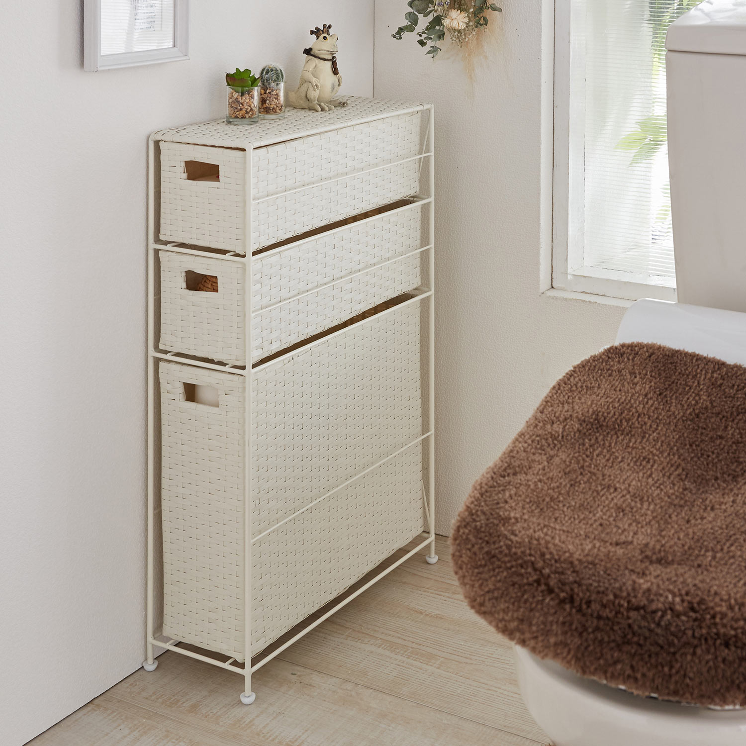 トイレをナチュラル & おしゃれに演出するチェスト一見ラタンのようで、実は水に強く扱いやすい樹脂製ですスリムなデザインなので狭いトイレにもすっきりと置け、収納スペースが作れます。上2段はトイレットペーパーがちょうど入る大きさで、1段にトイレットペーパーを4個収納できます。一番下の引出しは収納量があり、お掃除道具を入れるのにも便利