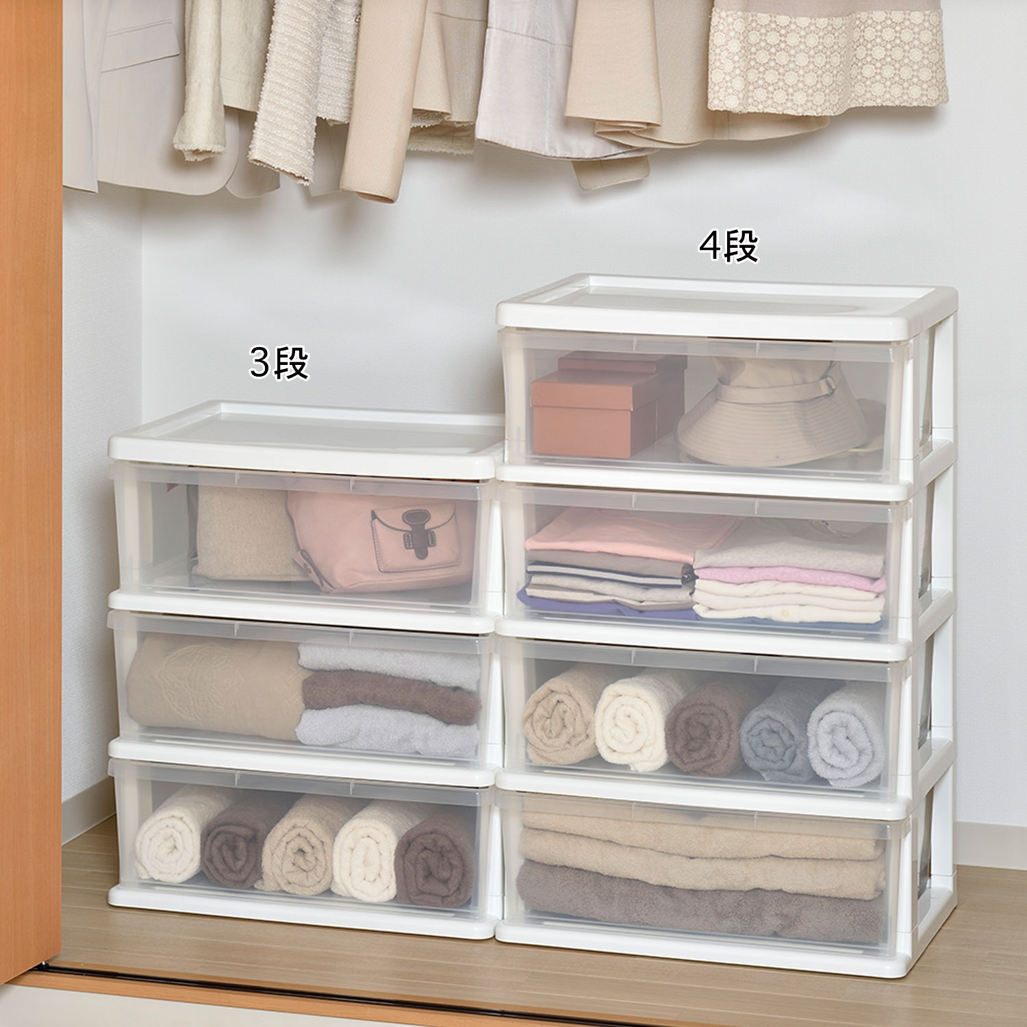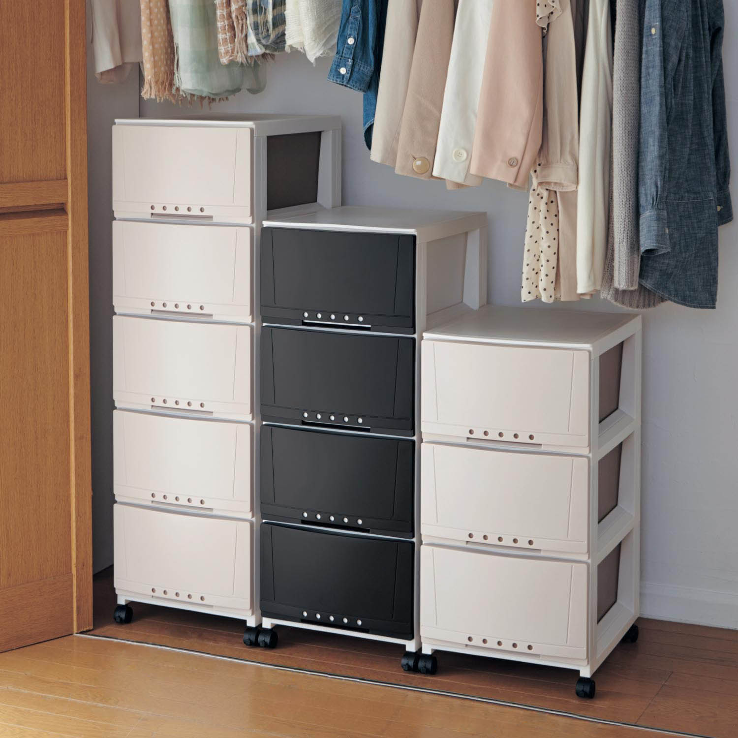 クローゼットにすっきり収まるサイズで、組み合わせて空きスペースを無駄なく活用することができます。引出しは抜け落ちないようストッパー付きキャスター付きで動かせます。