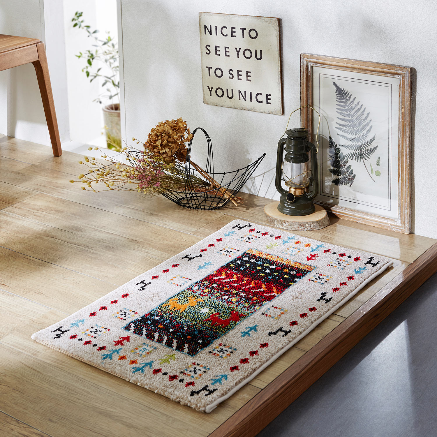おしゃれなギャッベ風デザインのウィルトン織り玄関マットひとつひとつのモチーフが繊細で緻密な仕上がり。毛足が短めのウィルトン織りなので、掃除機がかけやすくラク薄手なので、ドアの近くでも安心1年通じて使えます。)