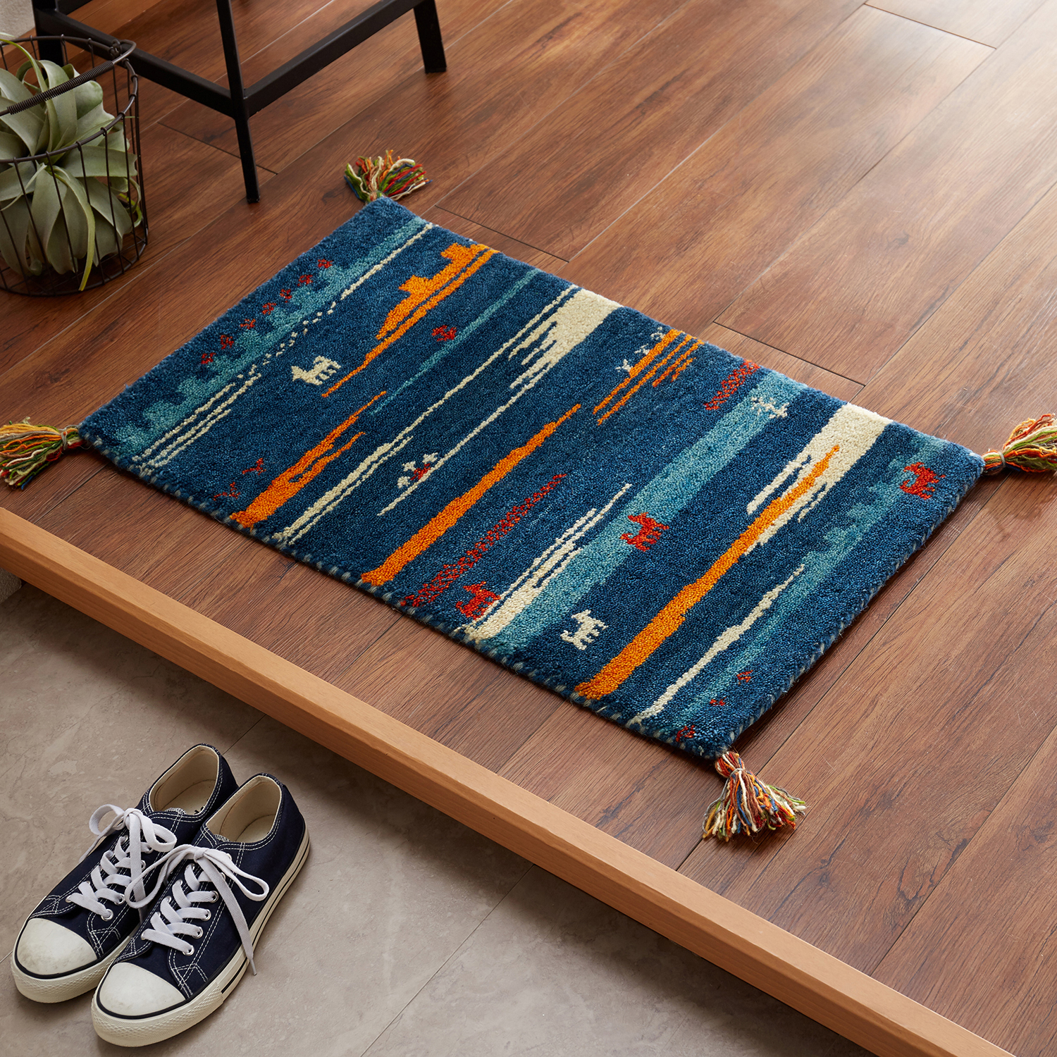 ギャッベらしい鮮やか色味やデザインが素敵な玄関マットひとつひとつ色合いや織りの表情が違って見えるのは手織りならではのポイントあたたかさと優れた吸放湿性のあるウール素材を使用しっかり厚みがあり、踏み心地も快適四隅の房飾りもかわいいアクセント)