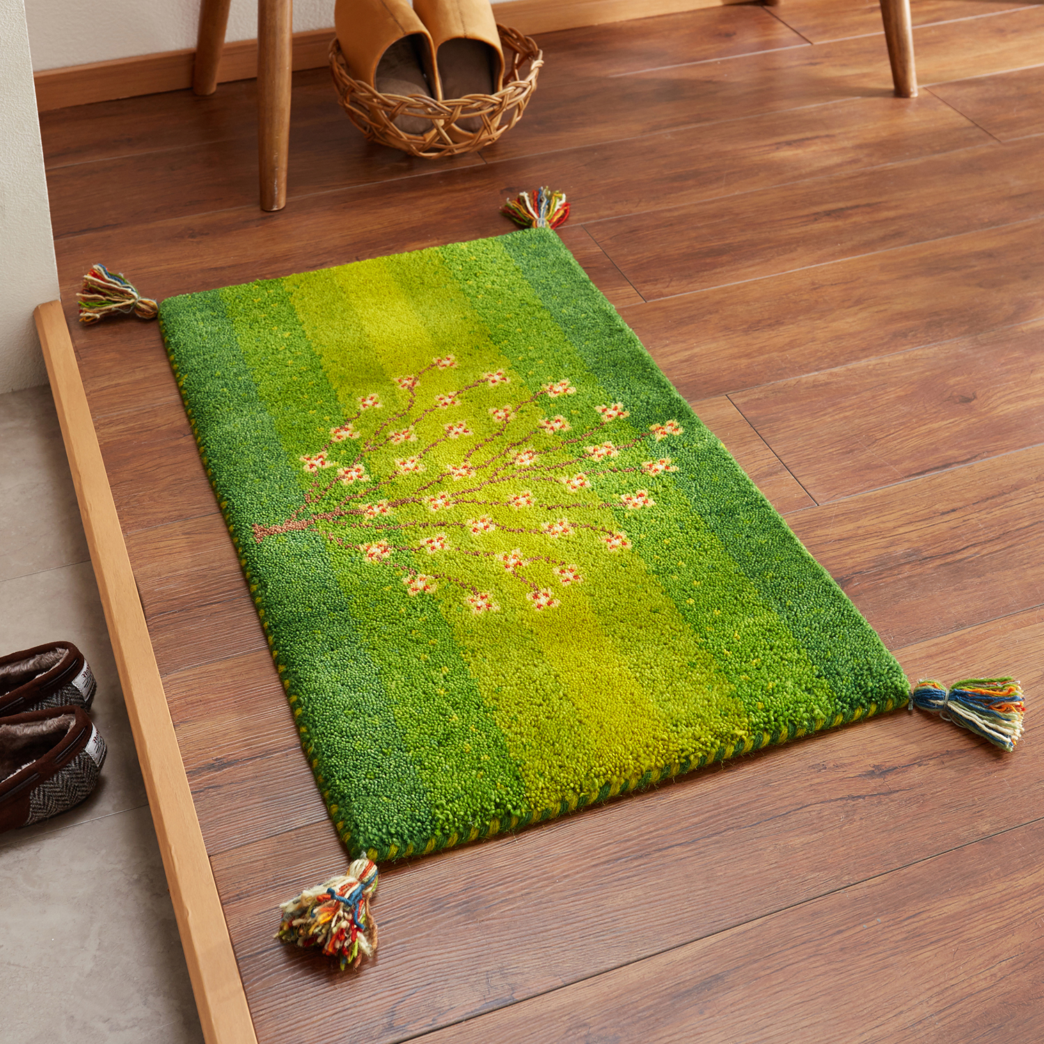 グラデーション×シンボルツリーデザインがおしゃれなギャッベ玄関マットひとつひとつ色合いや織りの表情が違って見えるのは手織りならではのポイントあたたかさと優れた吸放湿性のあるウール素材を使用しっかり厚みがあり、踏み心地も快適四隅の房飾りもかわいいアクセント)