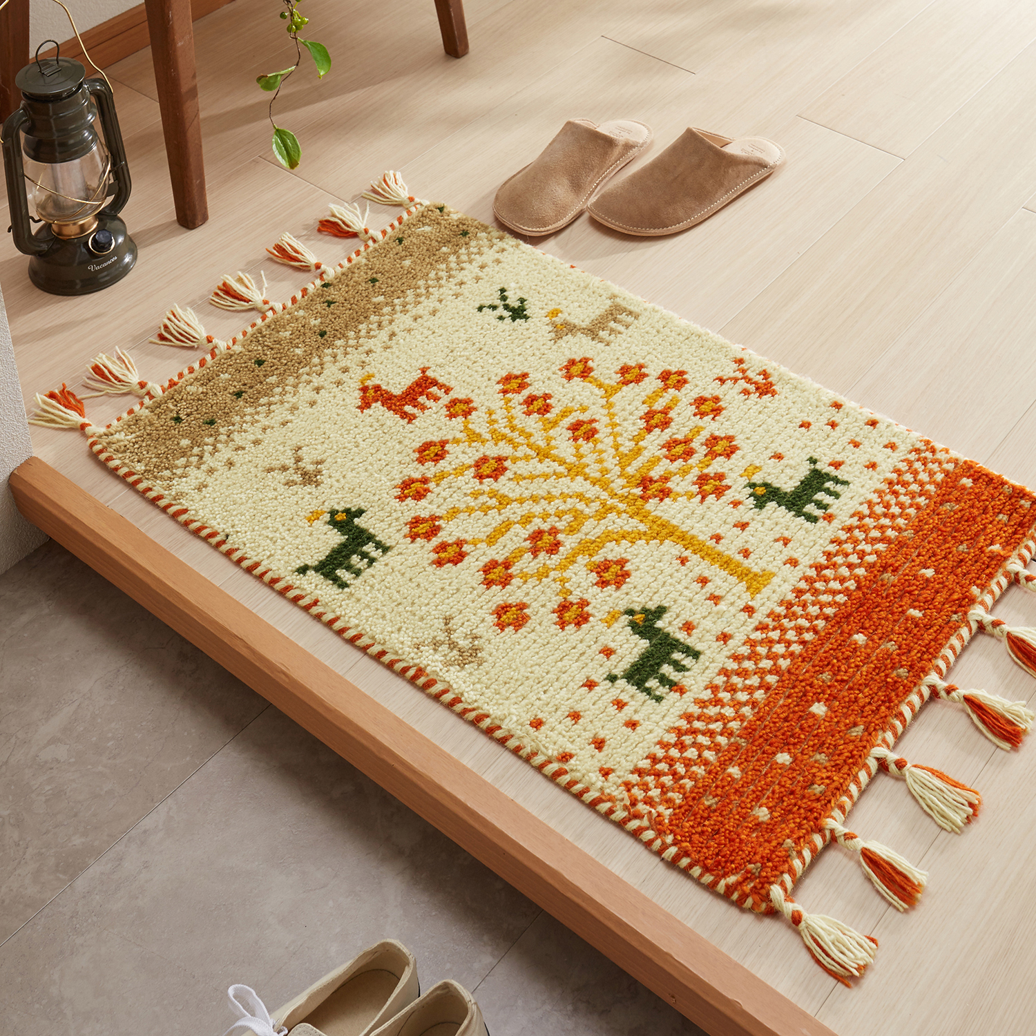 インドの職人によって手間ひまかけて織られた手織りのマット山や木、動物、人など自然の景色をそのまま描いたようなデザイン密度たっぷりのウール100%素材を使っていて、しっかり踏み心地もいい厚みもあるので玄関やチェアのそばにぴったり四隅のフリンジもポイント南ペルシャの遊牧民によって織られているアートギャッベをイメージしたマット。愛らしいモチーフが散りばめられていて、眺めていても楽しい。)
