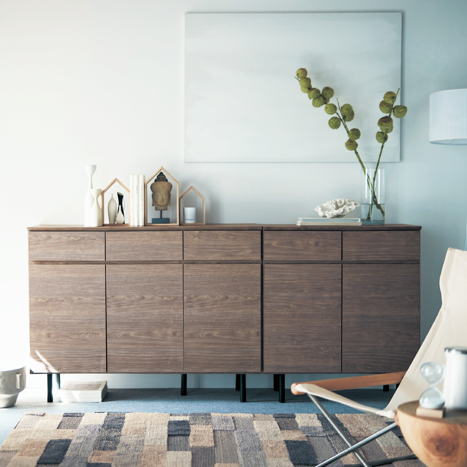 最近人気のグレーがかった色の建具の内装にしっくりなじむキャビネットきれいに流れる木目柄とシックなグレーが調和してモダンな雰囲気にシンプルな黒い脚がアクセント、掃除のしやすさも魅力です天板の斜めにした丁寧な仕上げ引出しは奥までしっかり引き出せるフルスライドレール式扉は押すだけでラクに開くプッシュ式家電もすっきり収納できるようにコード穴付き)