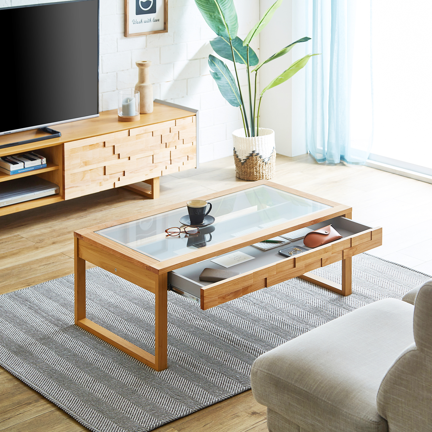アルダーの凹凸のある無垢材とスモーキーカラーを組み合わせた、温もりを感じさせてくれる北欧モダンスタイルのローテーブルガラス天板の仕様で収納物を飾れます引出しの内部をグレーカラーで仕上げロの字脚の脚部はすっきりした見た目で、圧迫感も軽減してくれます同シリーズの「テレビ台」と合わせたコーディネートがおすすめ)