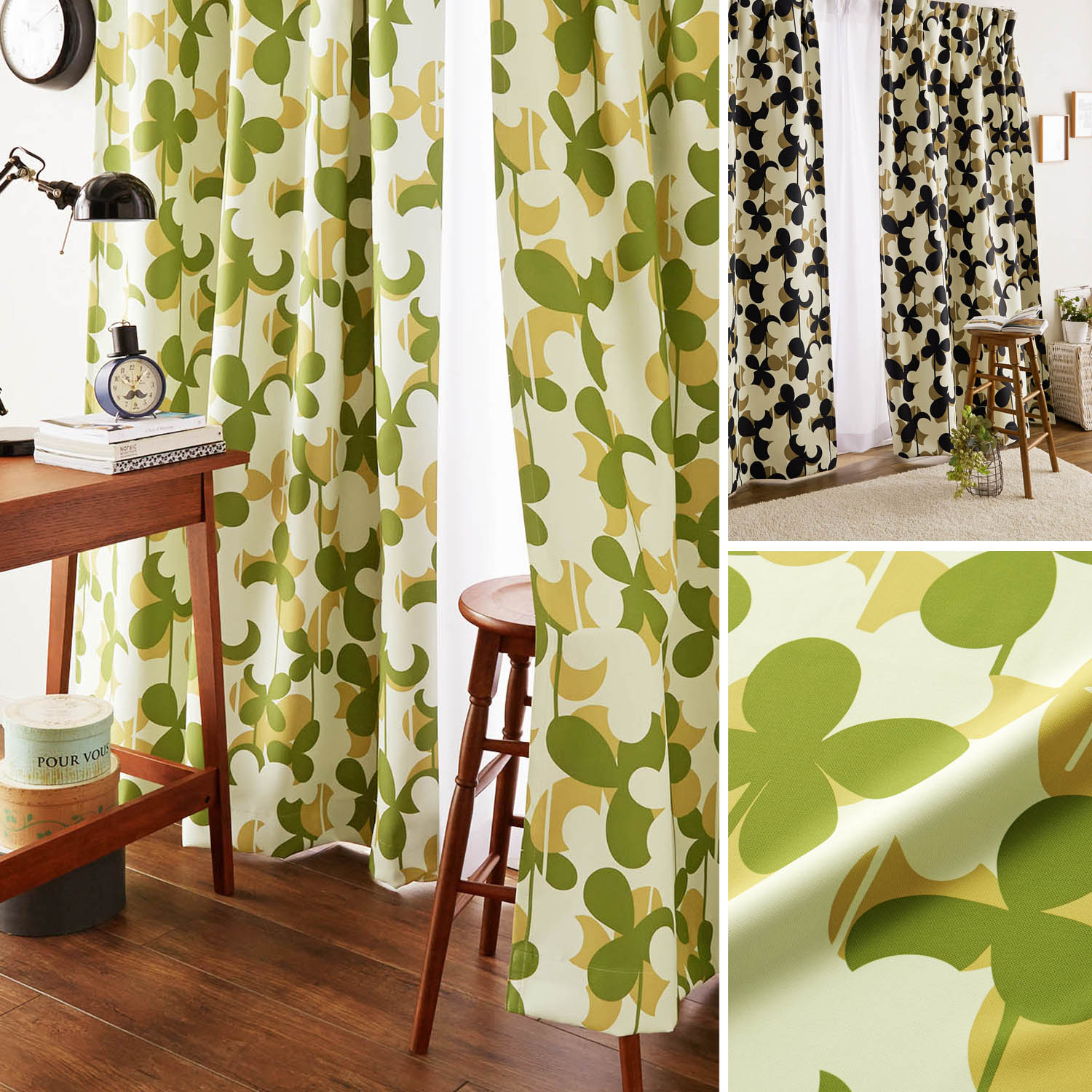 大きさの異なるクローバー柄を大胆にあしらった総柄デザインのカーテン窓辺を華やかに演出してくれる北欧調デザインは、幅広いインテリアに素敵にマッチします。外からの光をやさしく遮ってくれる、遮光機能付きナチュラルな雰囲気の「グリーン」、シックな印象の「ベージュ」はどちらもインテリア性抜群です