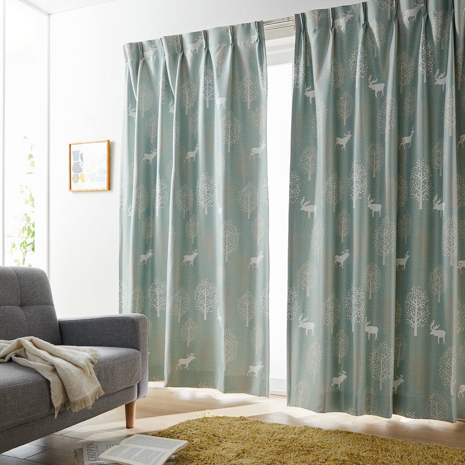 静かな森の中に、ヘラジカがかくれんぼ人気の北欧風インテリアにもマッチする大人かわいいデザイン細かな柄で主張が強すぎず、使いやすい柄物カーテンです光を遮る効果のある遮光2級機能付きベージュ・グレー・ライトブルーの3色から