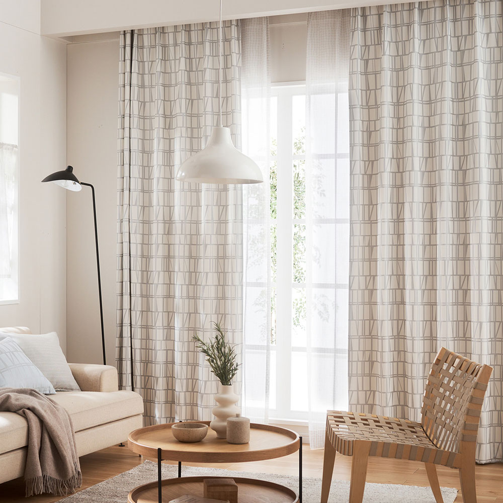 幾何学模様とボタニカルを融合したような、まさに北欧インテリアっぽい柄のカーテン