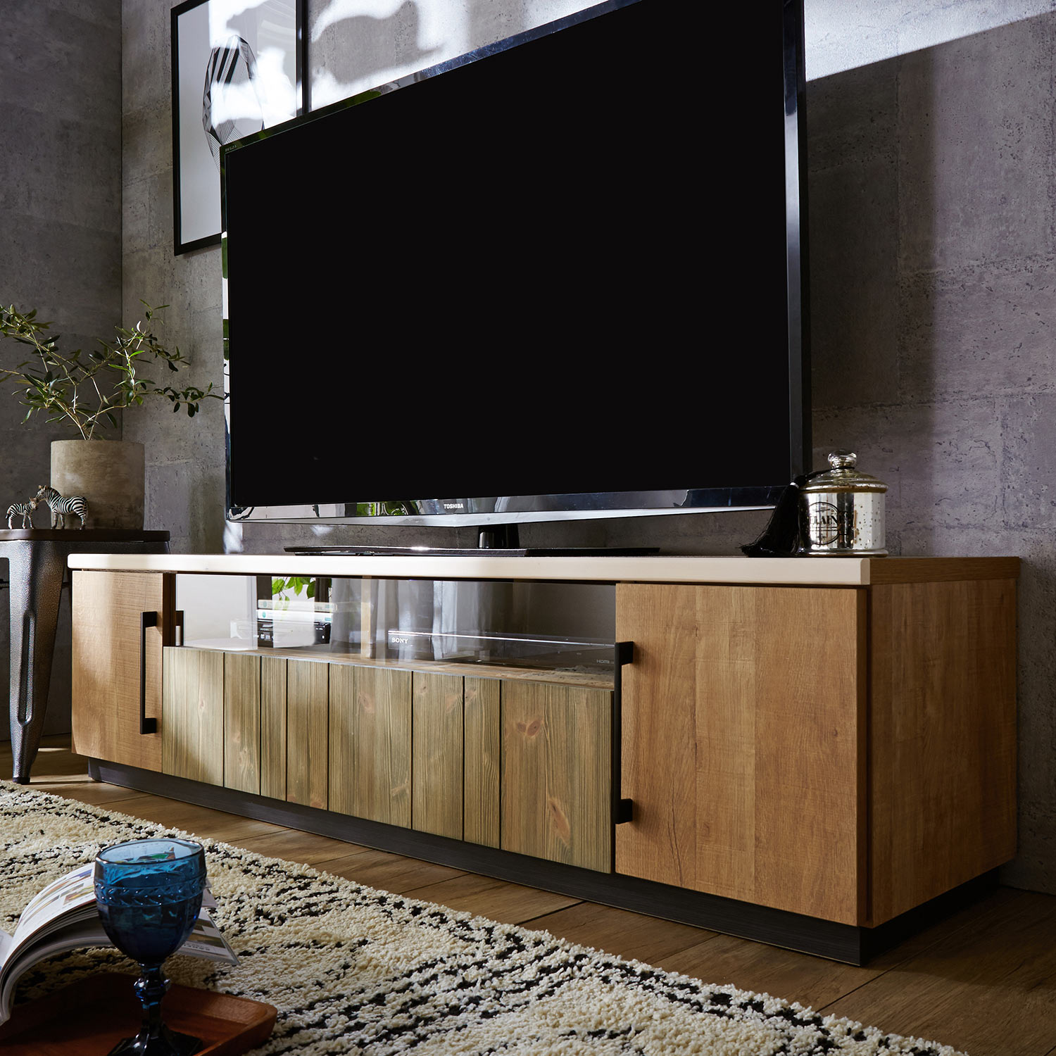 インダストリアルな雰囲気漂うヴィンテージ調テレビ台引出し前板には風合いのある節ありパイン材を使用扉や天板には古材風の木目調シートを使い、表情のある荒々しさを楽しめるデザイン天板縁にはホワイト調ラインでアクセントをプラス扉内は縦置きのルーター類を収納でき、コード穴で配線スムーズ引出しはたっぷり収納しても開け閉め楽ちんなフルスライドレール仕様で使い勝手抜群仕切り板を2枚備え、収納に合わせて取り外し可能引出し上部に付いたデッキ収納部カバーはガラス製なのでリモコン操作もスムーズですシリーズのリビングテーブルとコーディネートするのもオススメです