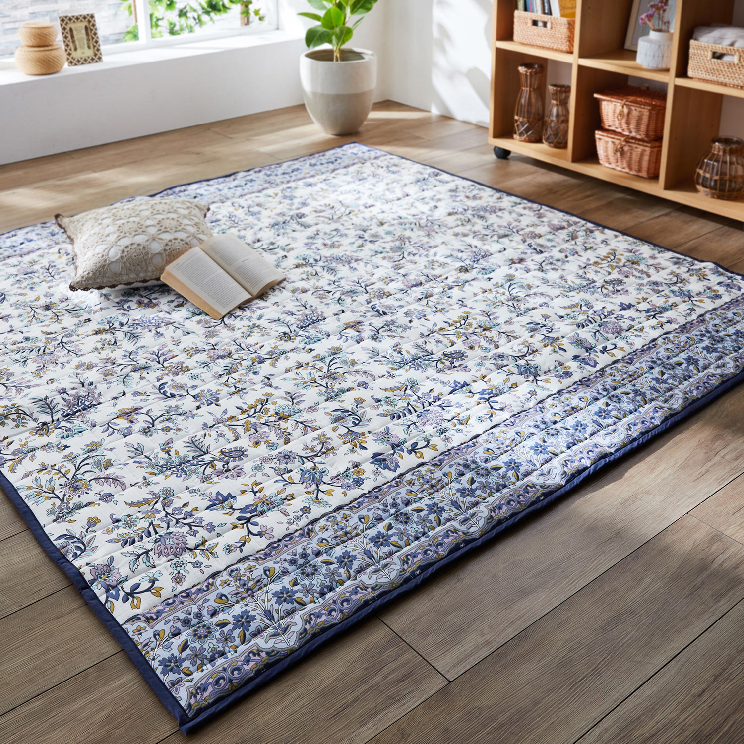 フレンチカントリーなインテリアにもマッチしそうな爽やかなブルーの花柄入りのキルトラグ