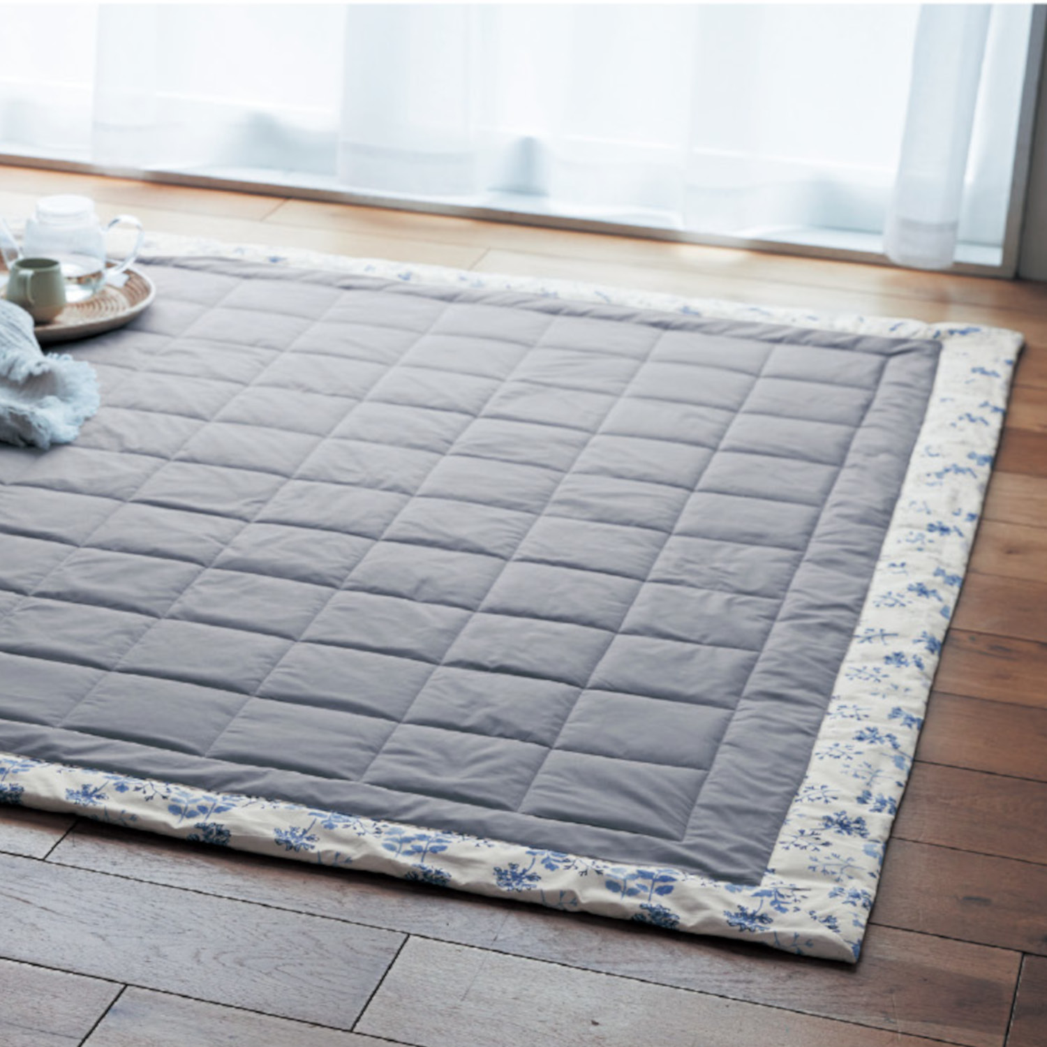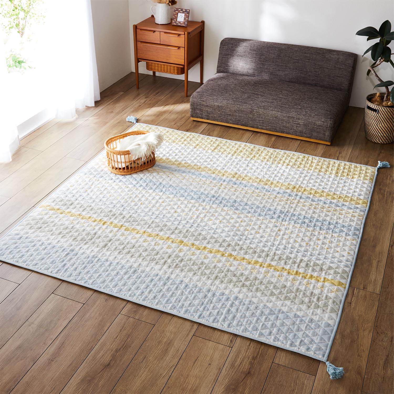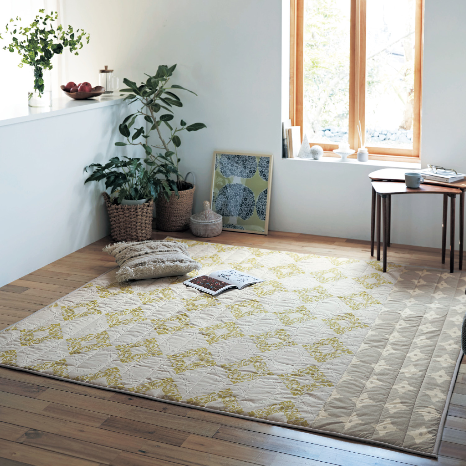 ーデザイン・スタイリングー・繊細な地模様が格上のニュアンス・柄を切替えて大人シックにデザイン・ストレートなキルトパターンもひと味違う印象・広げるだけでフロアを北欧風に演出ー素材ー・年中使えるサラリとした綿素材で風合いもグッド・しっかりとした素材感に高級感漂うー機能ー・ホットカーペット対応で一年中重宝・洗濯機で手軽に洗えてお手入れもスムーズ